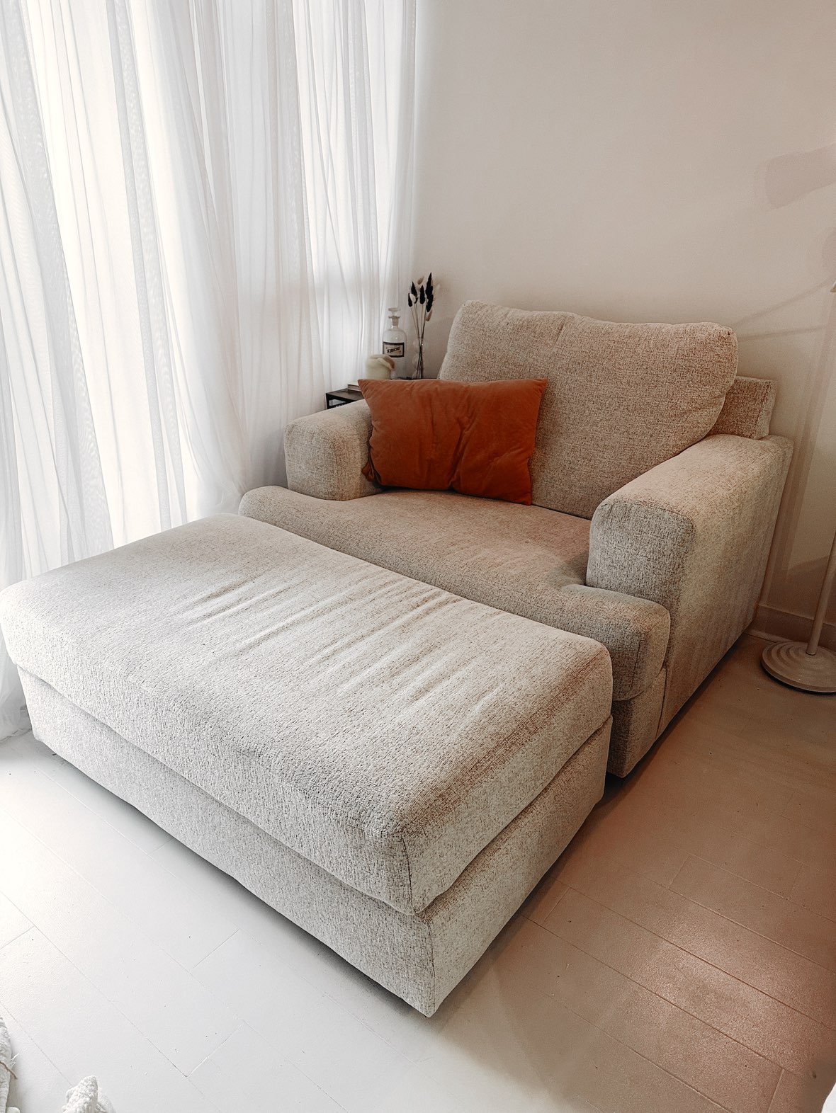 Selling Lightly Used Super Comfy Oversized Chair & Ottoman - willing to sell separately or as a set. Detailed dimensions below. (purchased October 2023) —— Chair Details & Dimensons Fabric: Chenille Color: Stone Overall 52” W x 40” D x 39” H Arm Height 27” Distance between arms 30” Leg Height 2.25” Seat Depth 23” Seat Height 21” Top of Cushion to Top of Back 19” Recommended Doorway Width 32” Ottoman Details & Dimensions: Fabric: Chenille Color: Stone Overall 26” D x 20” H x 48” L Legs: 2.25” Recommended Doorway Width 32”