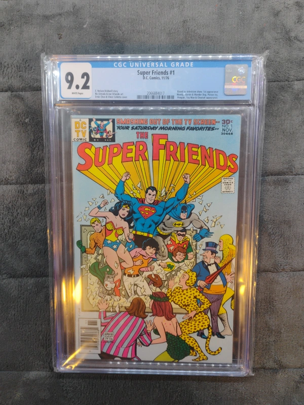 Selling a graded copy of Super Friends #1 from D.C. Comics, dated November 1976. This comic is graded 9.2 by CGC and is encased for protection. It features the first appearance based on the television show.