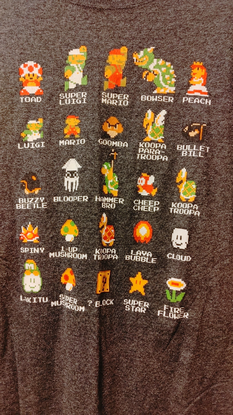 63Super Mario Bros. T-shirt featuring a pixel art design of classic characters like Mario, Luigi, Bowser, and Peach! The shirt is a size medium and made of a comfortable cotton/polyester blend