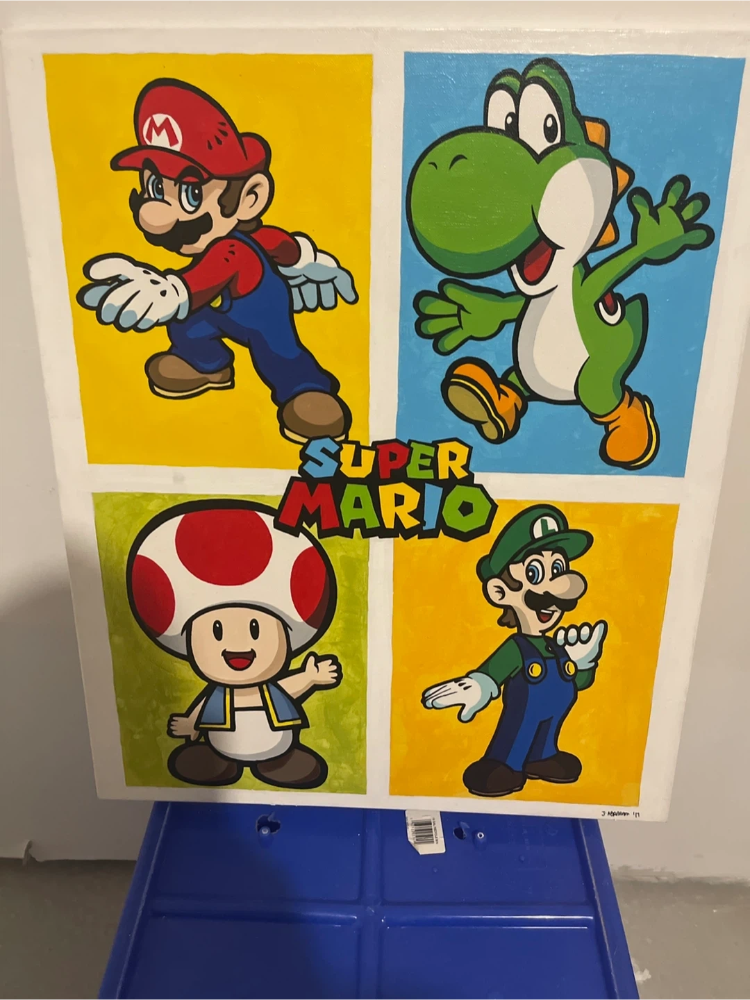 27Selling a Super Mario painting featuring Mario, Yoshi, Toad, and Luigi! It's a fun piece for any Nintendo fan Acrylic paint used Canvas is 16x24