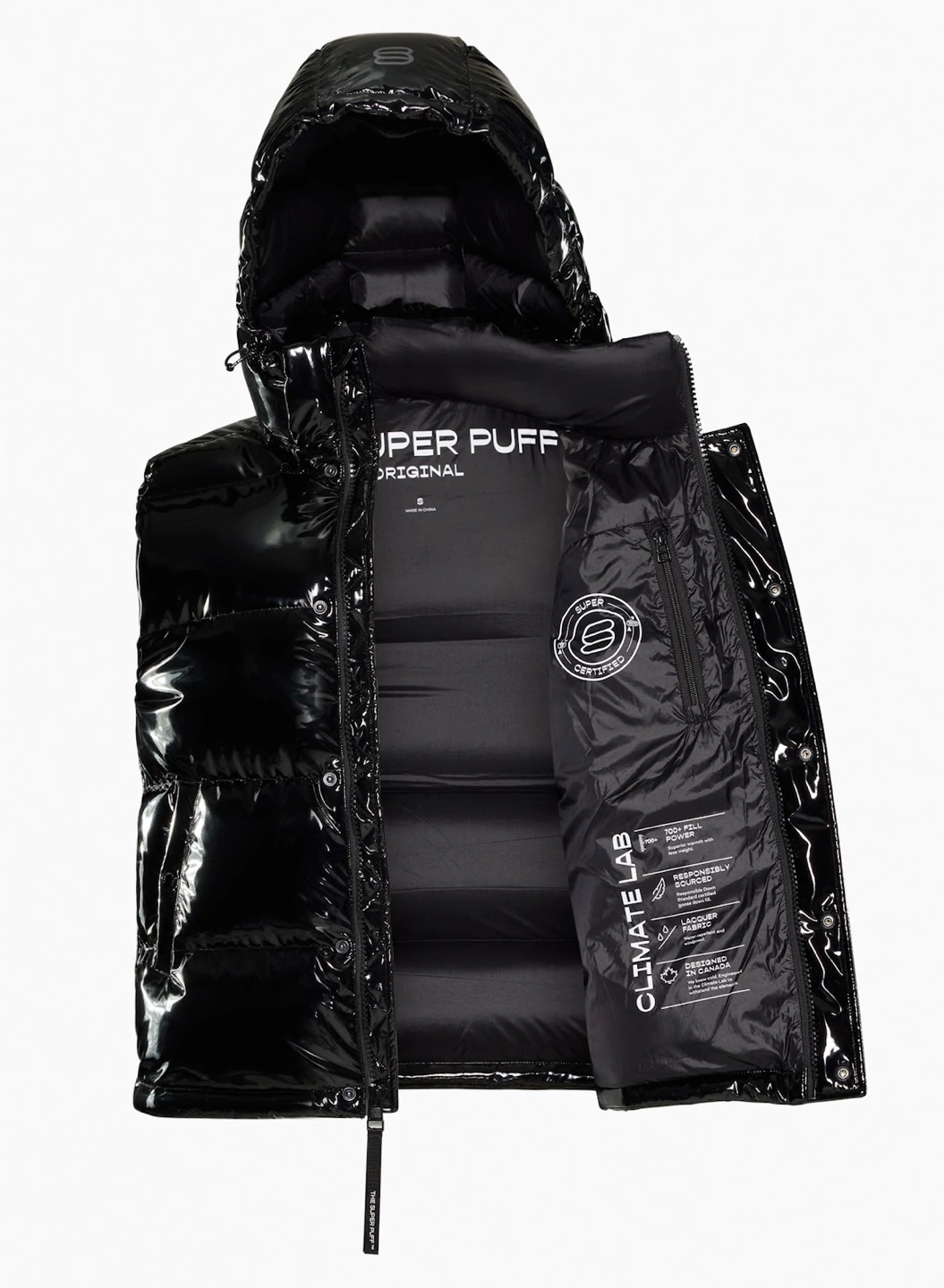 10Black patent puffer vest. Size small. Features a hood. Super Puff Original label visible. Climate Lab details inside. Like new, no rips, no stains, barely used. Was bought Nov 16 2024. Was bought for $250 originally.