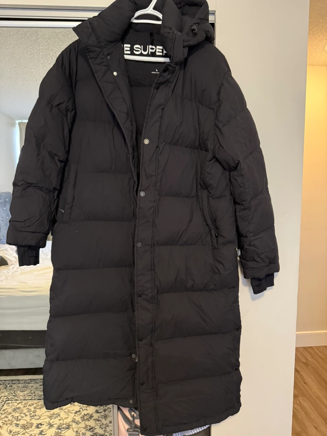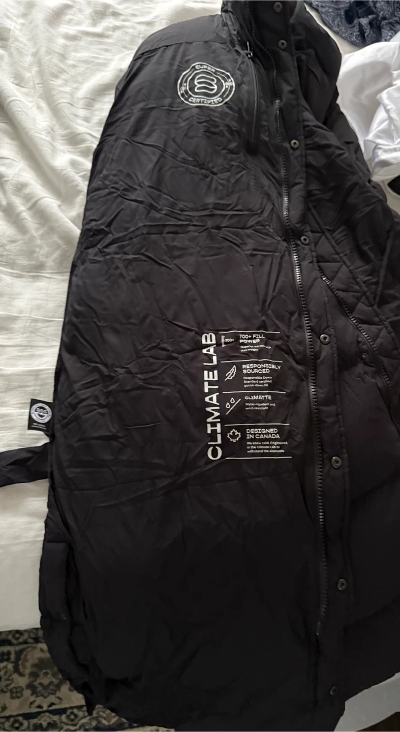 20Selling a Super Puff Long coat in size L. It's a black, insulated puffer coat that's perfect for the cold weather. The coat is designed in Canada and features responsibly sourced materials. It's in great condition! I wear it just a month and I find out that I’m allergic to feather It is very good condition. No ripped no broken zipper or button is perfectly fine because it’s still brand new. Bought it $450 plus tax.