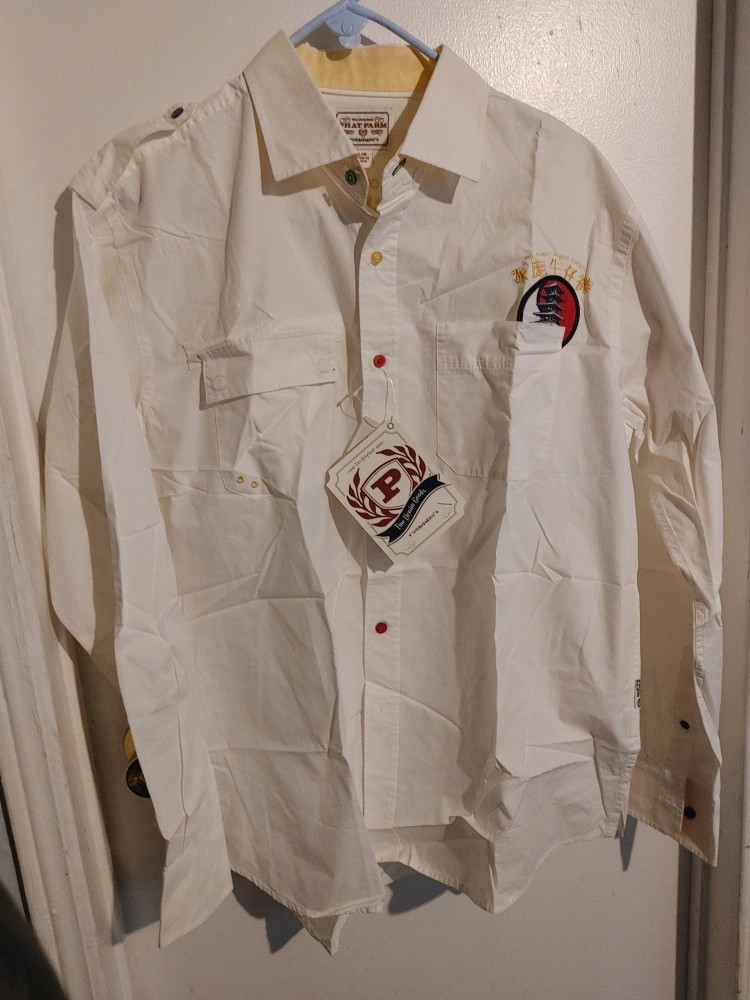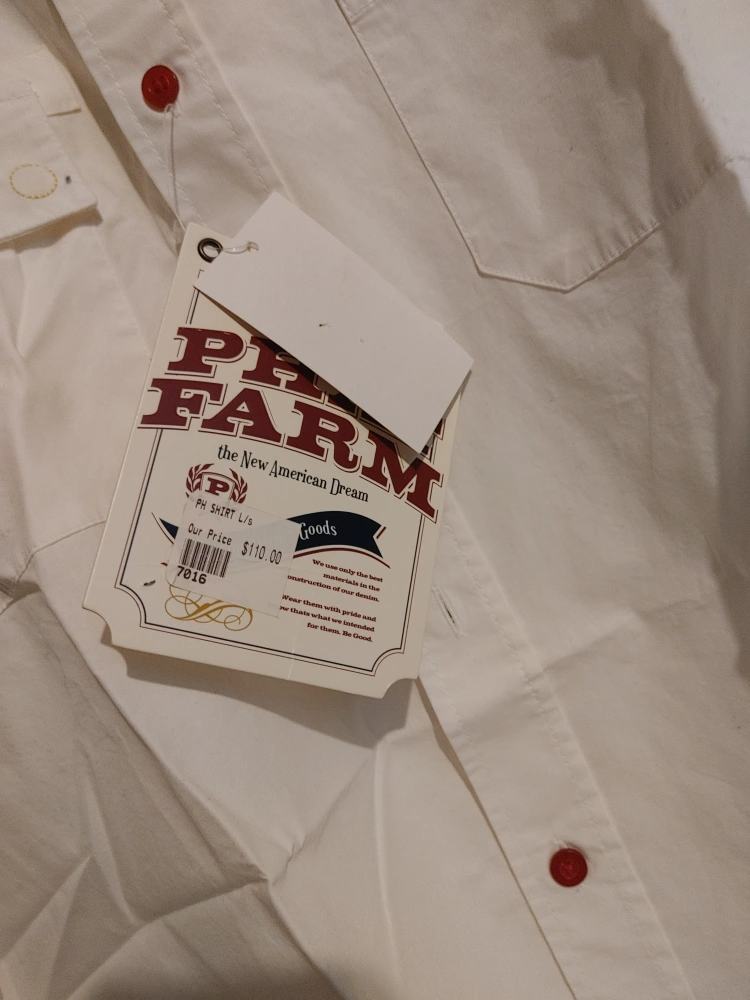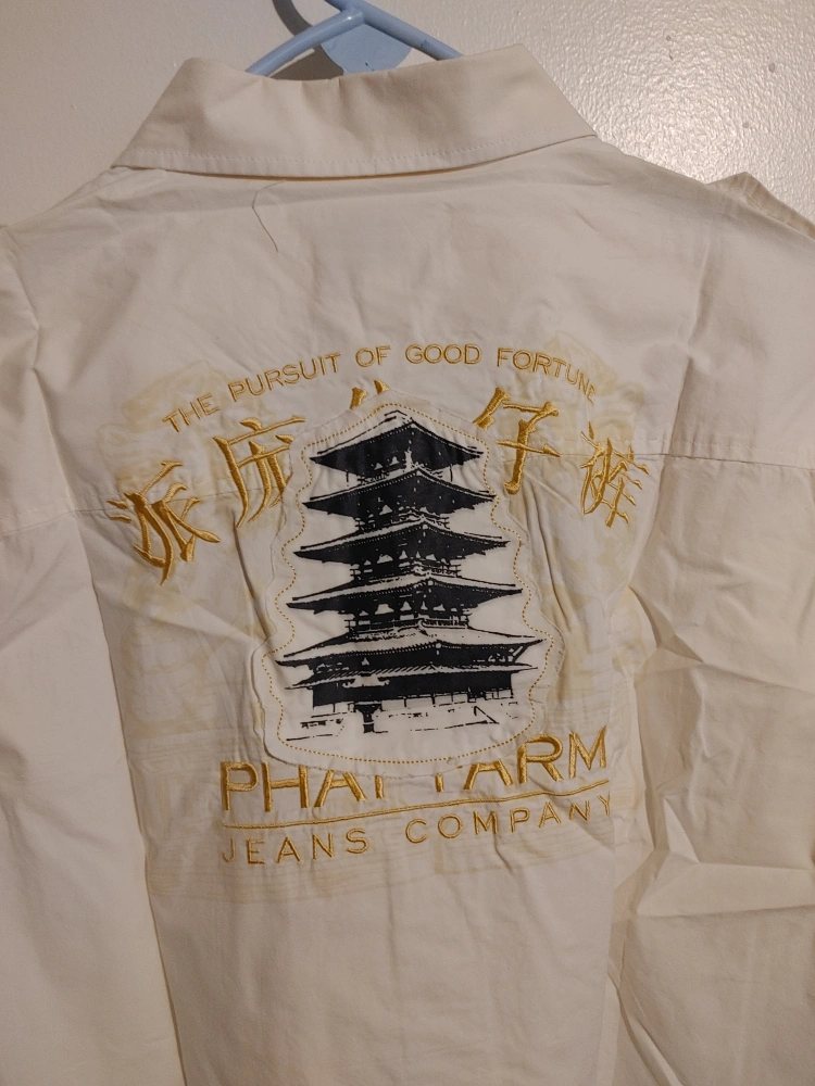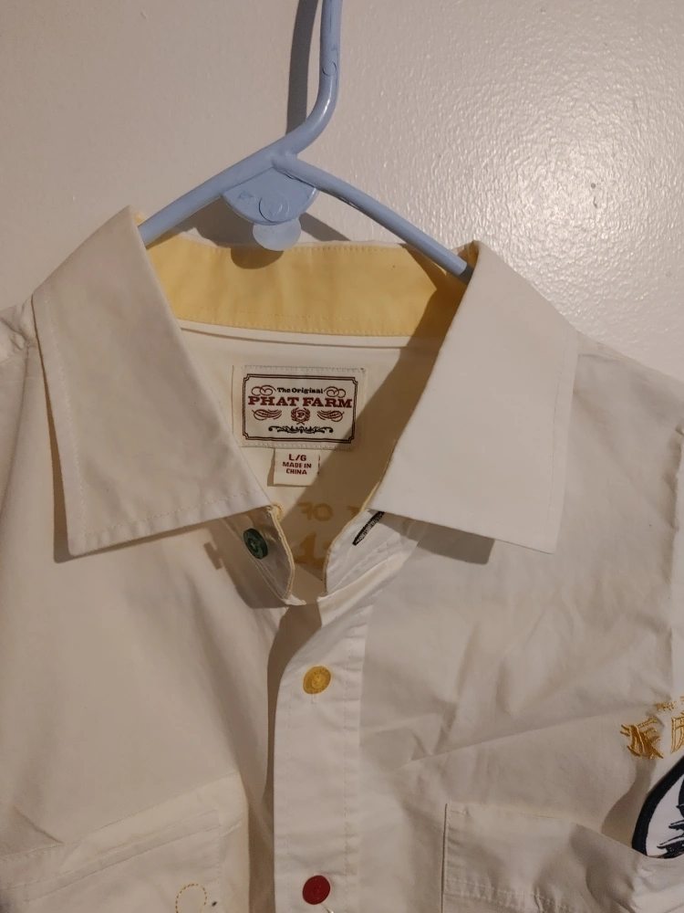 1000+🥕SUPER RARE OG PHAT FARM LONG SLEEVE SHIRT. OLD SCHOOL VIBES! 🥕MENS LARGE👇🏼 ARMPIT TO ARMPIT 23 INCHES ACROSS TOP OF COLLAR TO BOTTOM HEM 31 INCHES SLEEVE LENGTH IS 25 INCHES. 🥕REGULAR PRICE OF $110.00 🥕FEATURES EMBROIDERED GRAPHICS "THE PURSUIT OF GOOD FORTUNE", ON FRONT AND BACK. 🥕I AM LOCATED IN THE YONGE AND STEELES AREA FOR PICKUP THANK YOU😊😊😊