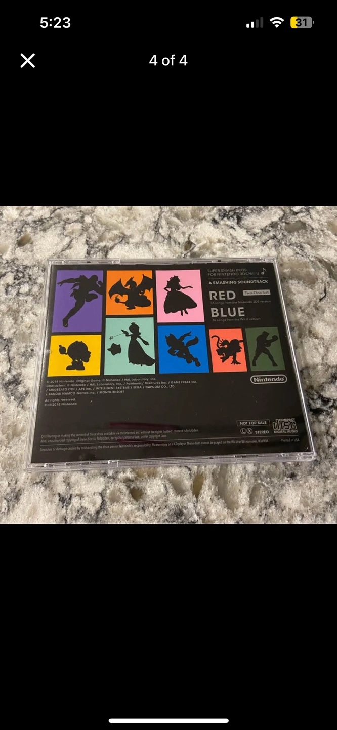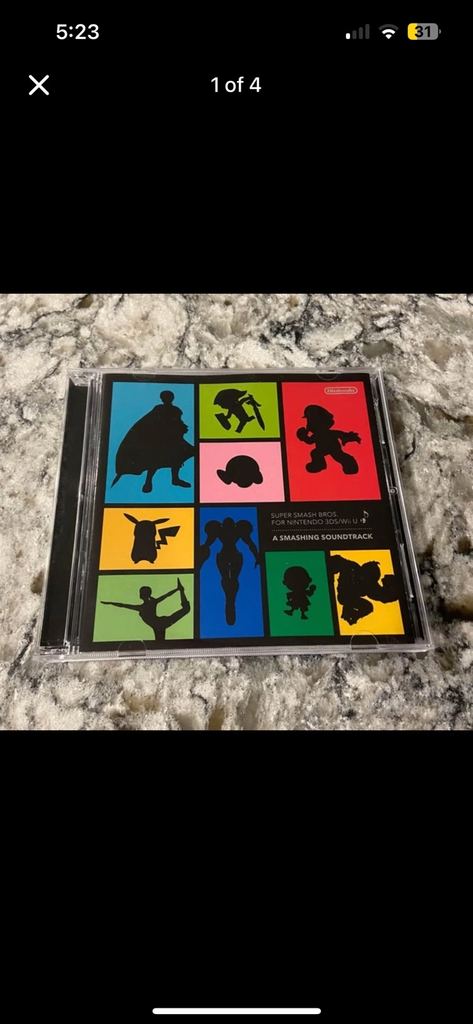 34Selling the Super Smash Bros. for Wii U Smashing Soundtrack Official Soundtrack CD. This was an exclusive collectable item that was available only through Nintendo’s discontinued Club Nintendo loyalty program. This CD was only given out to select members and was very limited in supply. The soundtrack includes 2 disks with numerous tracks from Super Smash Bros. series.