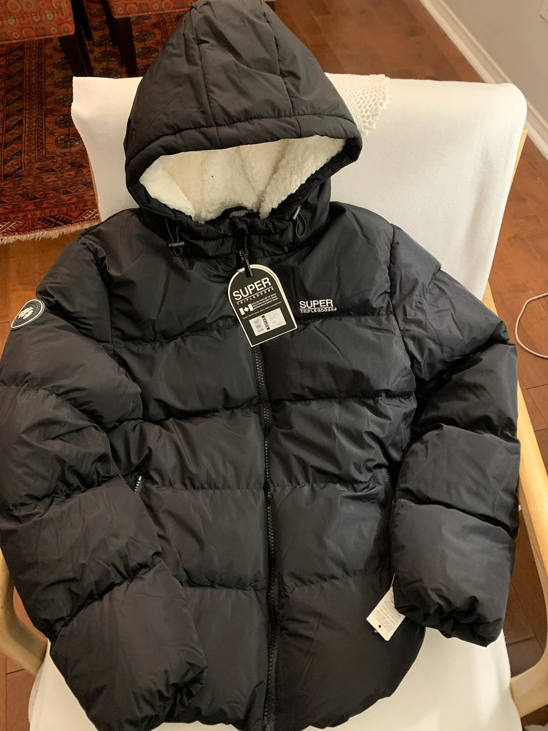 Selling a Super Triple Goose black puffer jacket in great condition! It's a stylish and warm choice for the colder months. The jacket features a cozy sherpa-lined hood to keep you extra snug. Perfect for staying comfortable and fashionable during the Canadian winter