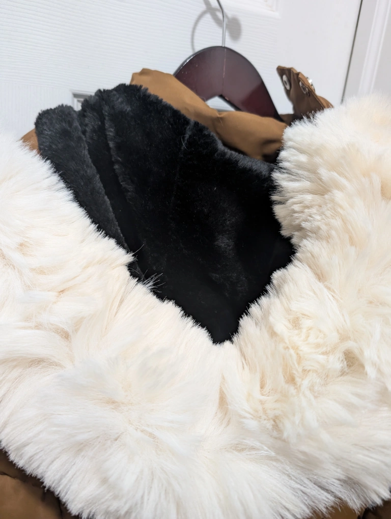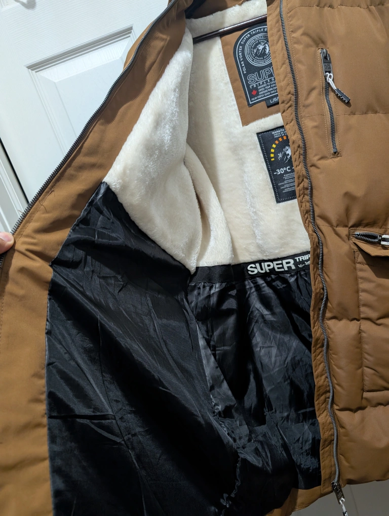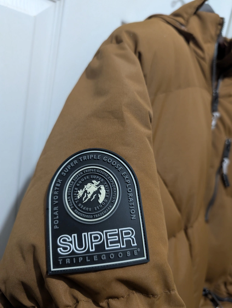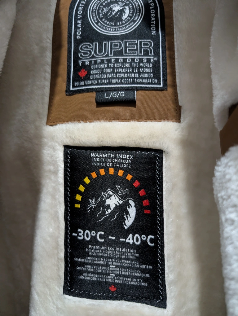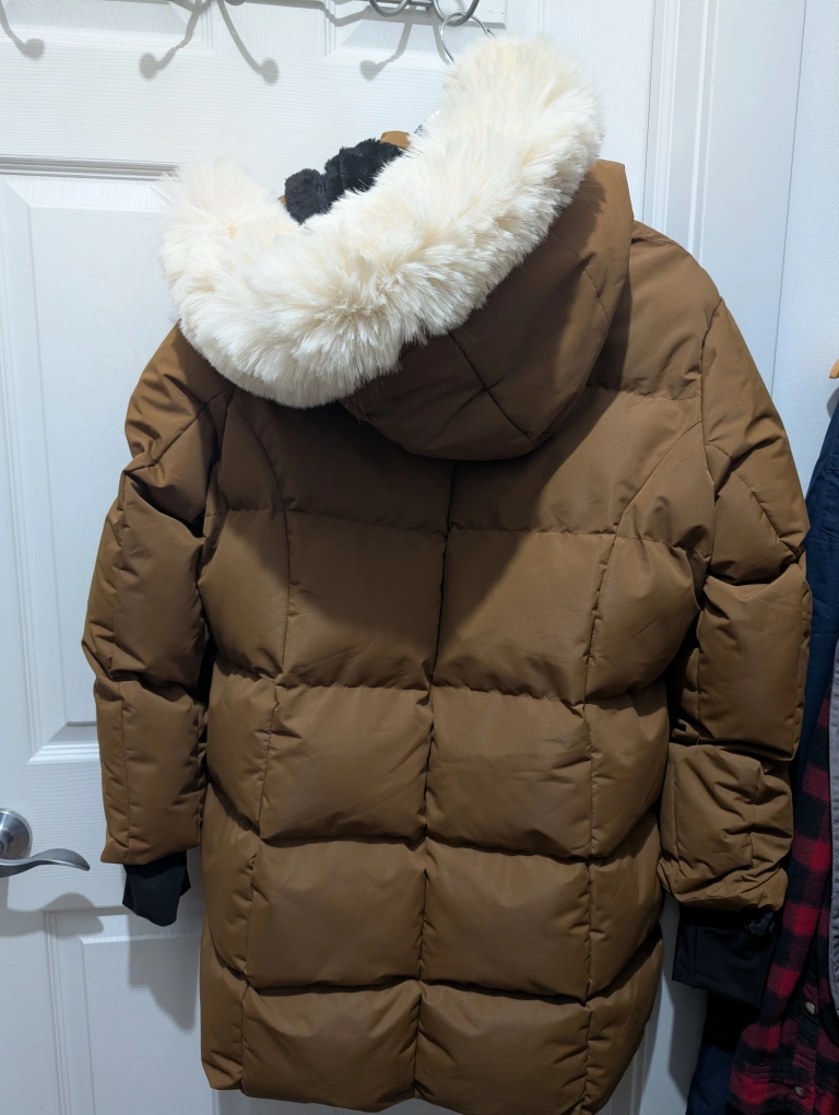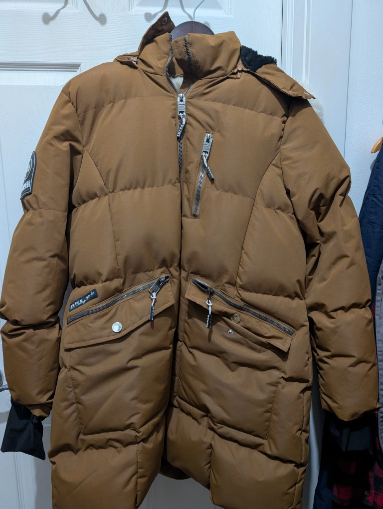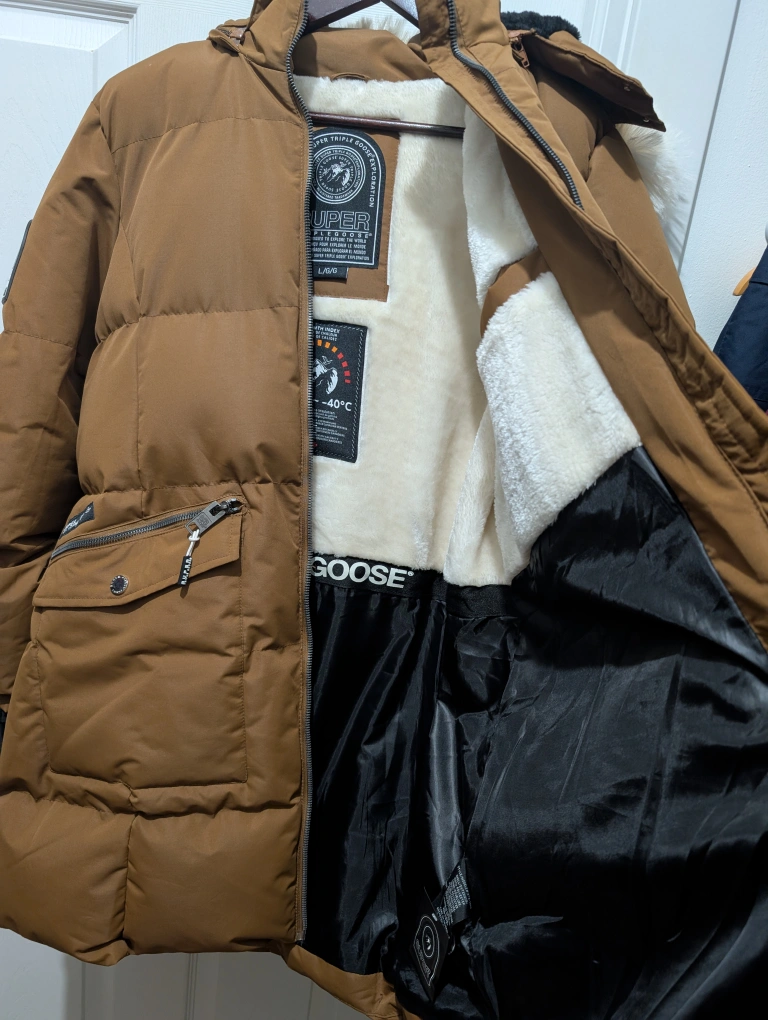 15Cozy and warm brown winter parka from Super Triple Goose, size large! It features a faux fur trim on the hood and a plush lining to keep you snug during those cold Canadian winters