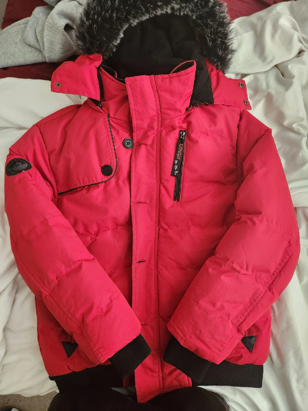 10Cozy red winter jacket by Super Troll Goose! Perfect for keeping warm during the colder months. The jacket features a faux fur-trimmed hood and a stylish design.