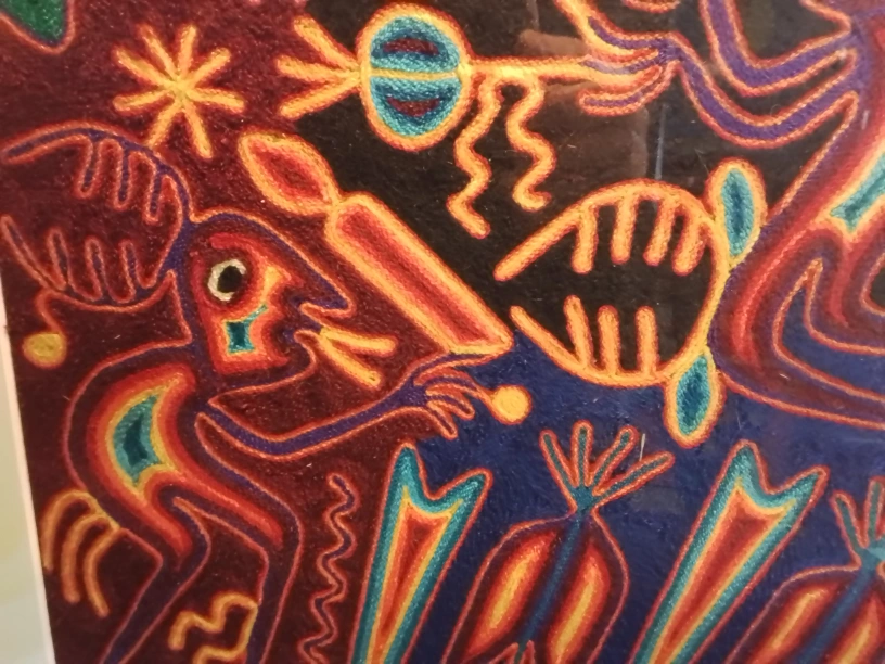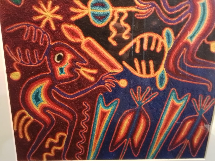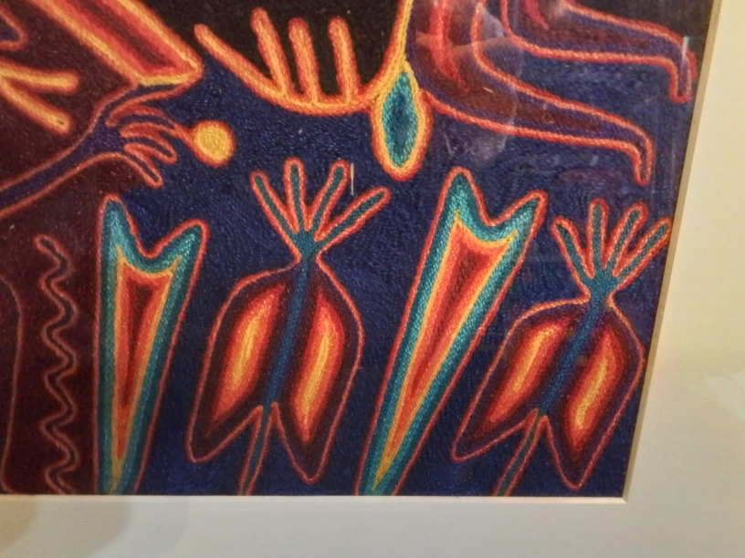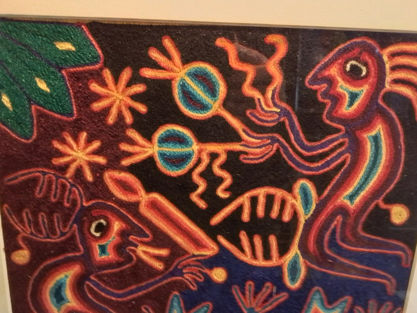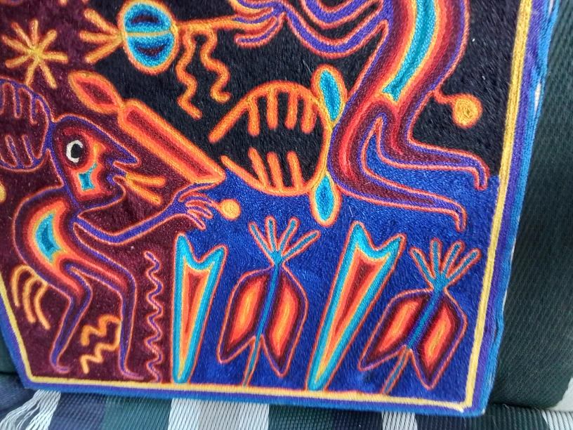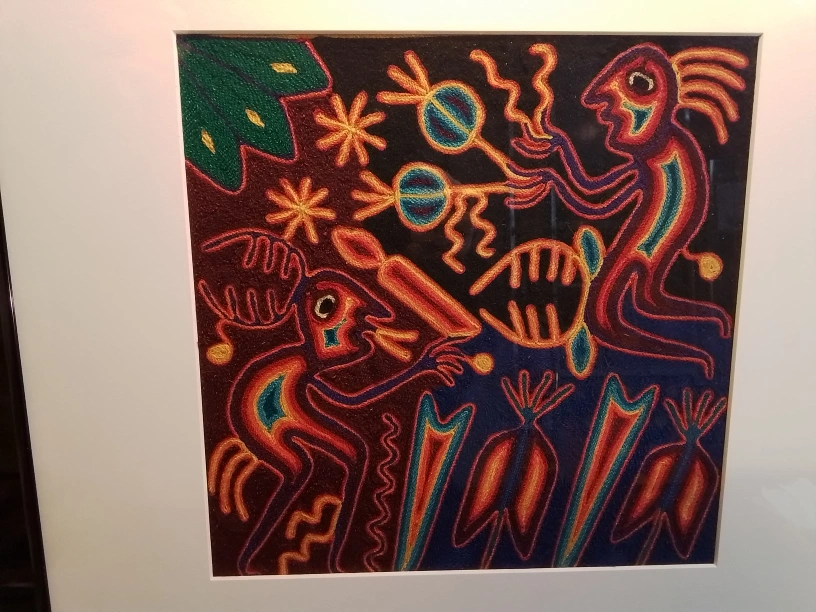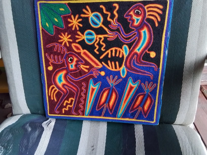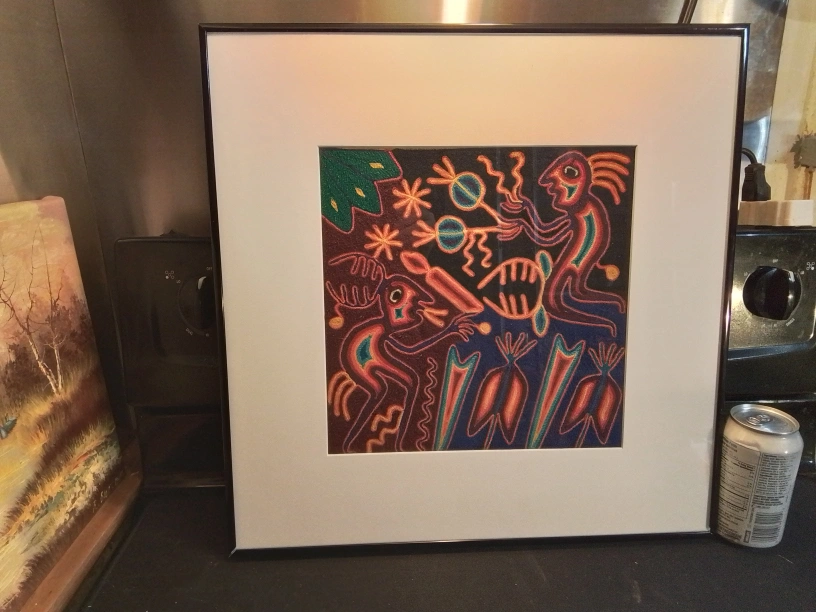 Superb Hand-crafted Huichol art Hand-woven Huichol art Superb Handmade Sewn Artwork Beautiful colours on this sewn piece of art. Condition: Good Condition Measurements: Frame 18 x 18, Art 12 by 12 inches Features vibrant colours and intricate designs, depicting traditional figures and motifs. Framed embroidery featuring traditional Huichol art. Colorful yarn on fabric. Pickup at Young Street and Steels Ave