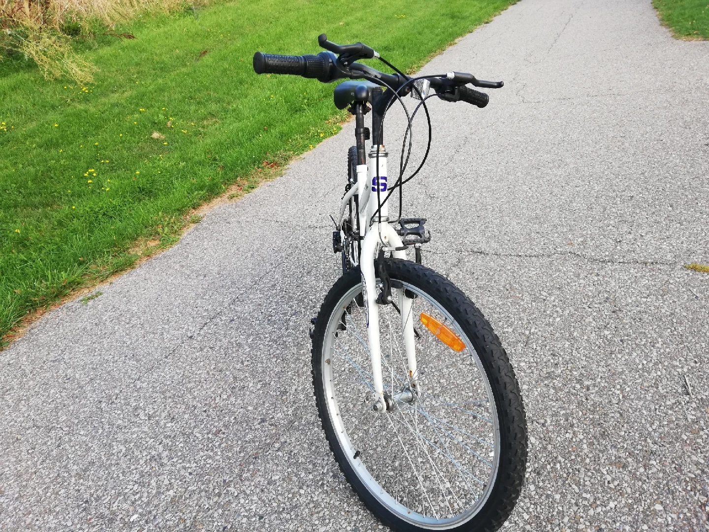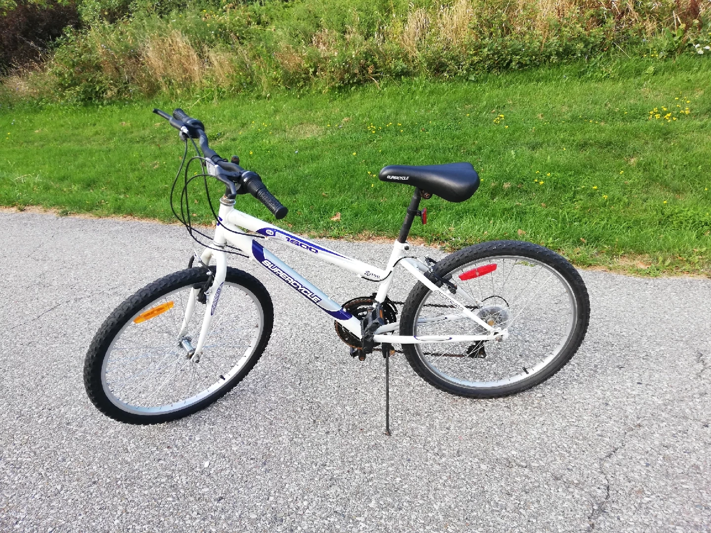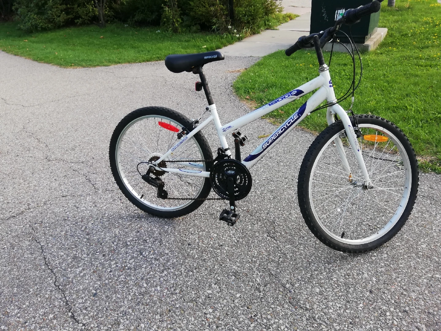 Selling a Supercycle 1800 girls' mountain bike. It's white with blue accents. Great for hitting the trails or just riding around the neighbourhood!