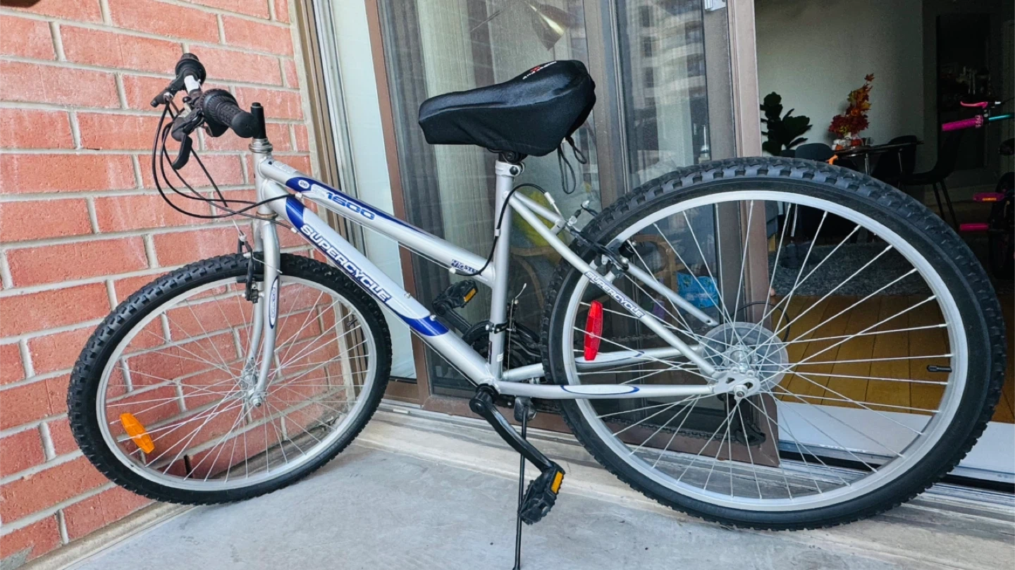 8Selling a Supercycle 1800 mountain bike in silver and blue! It has a comfortable seat and is ready for some outdoor adventures. Only used three times.