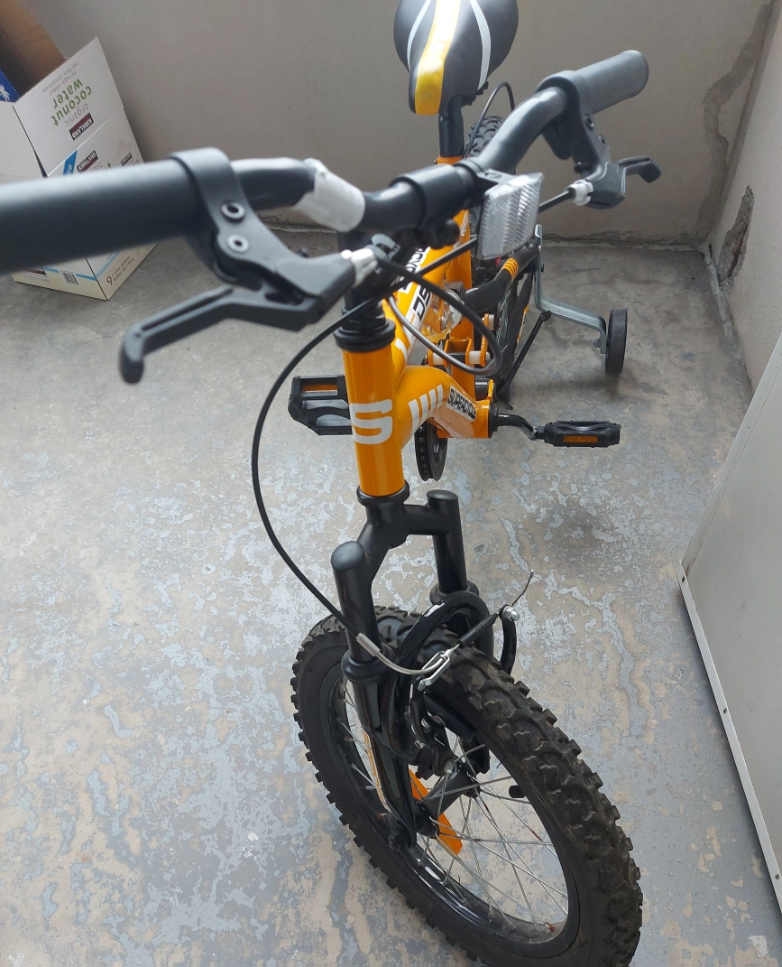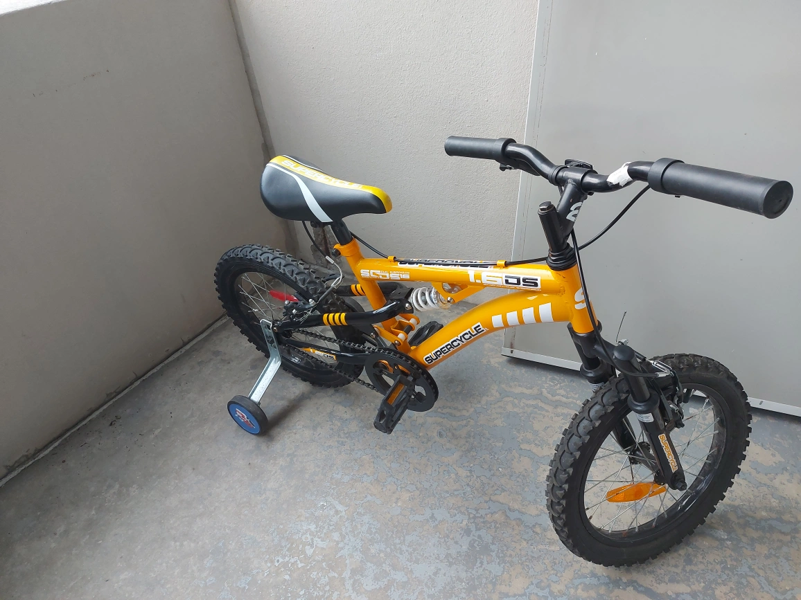 Supercycle bike 16in is in very good condition, including training wheels. Supercycle 1.6 DS Dual Suspension for kids bike with a high-tensile steel frame. 1.6DS is perfect for use on variable or rougher terrain with a dual suspension system. Suspension absorbs impacts for a smoother ride. You can test it before you pruchase. Price is negotiable.