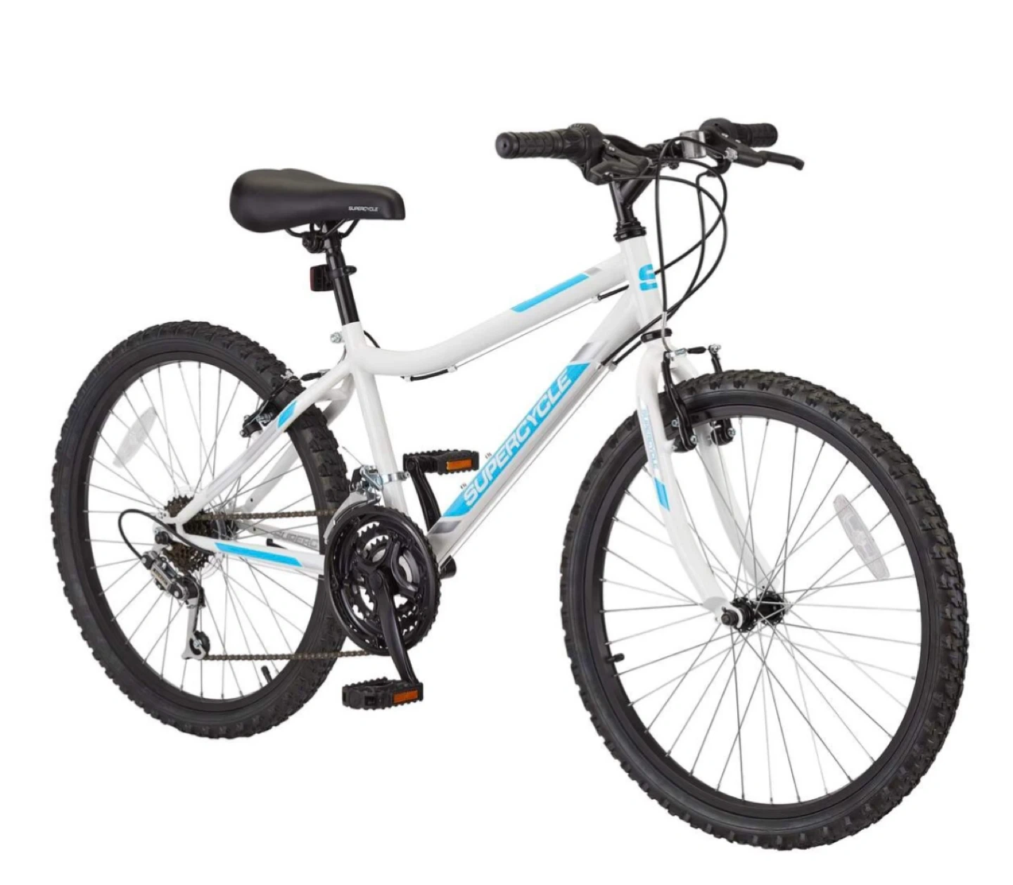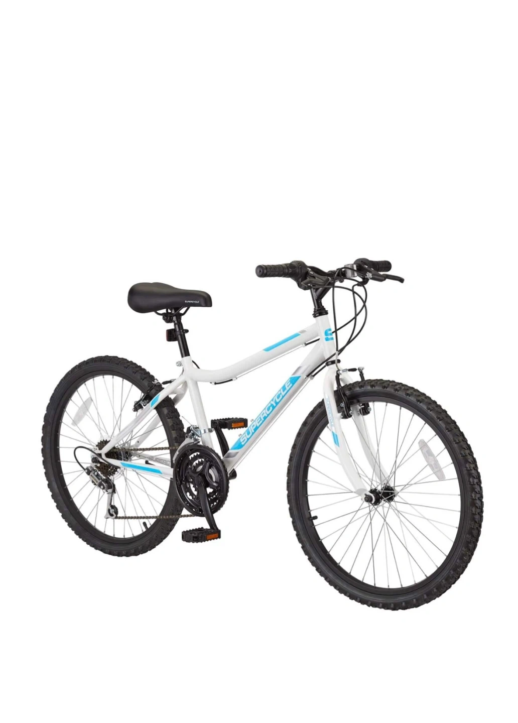 10Selling a Supercycle Girls' Mystique Mountain Bike with 24-inch wheels. It's a great bike for young riders ready to explore trails and paths! The bike features a sturdy frame and responsive brakes, making it safe and fun to ride. The white and blue color scheme gives it a stylish look, too