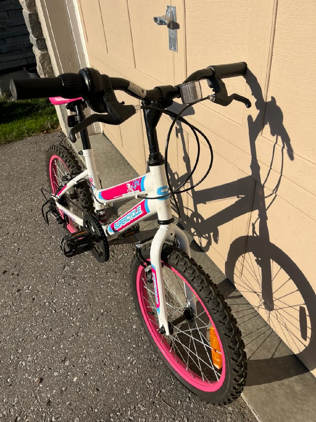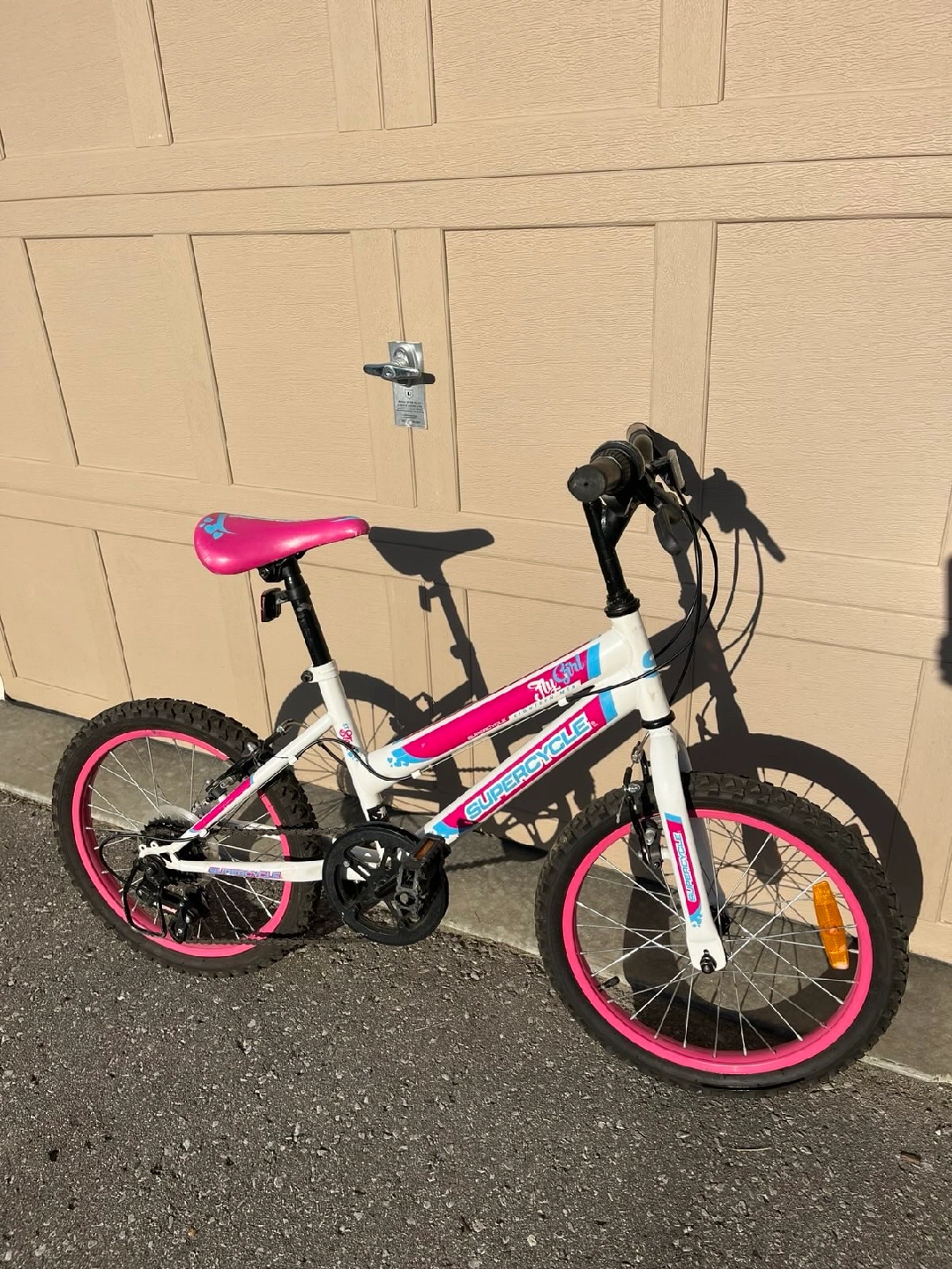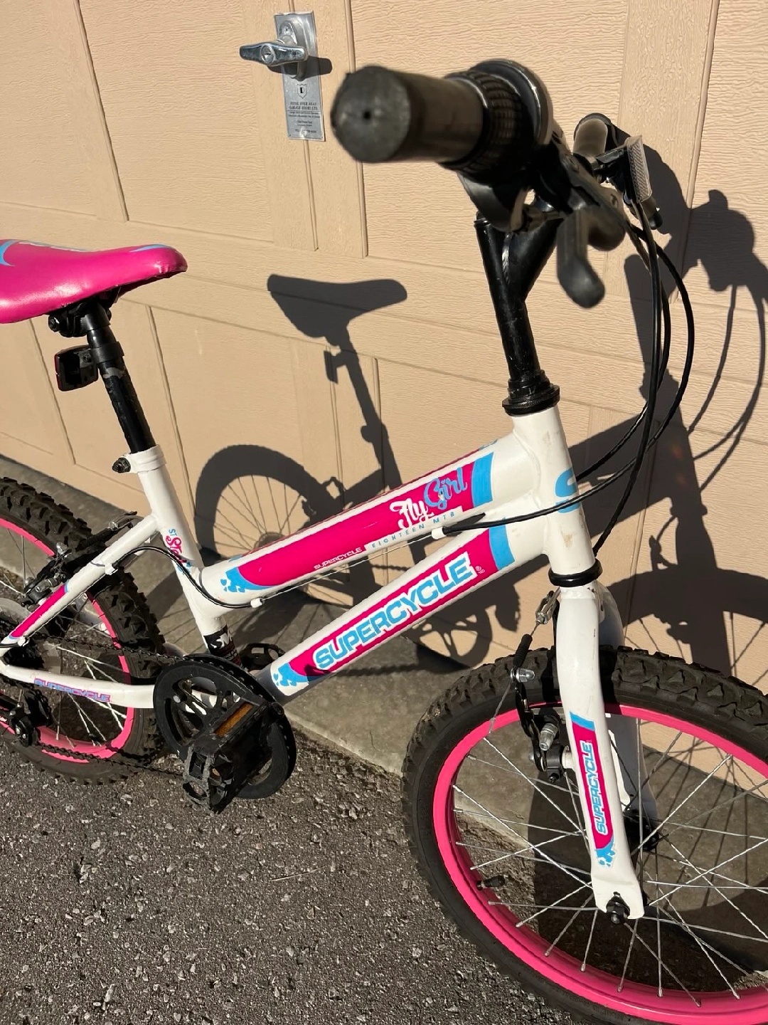 Selling a Supercycle Fly Girl 18-inch bike. It's white with pink accents and in good condition! Perfect for a young cyclist.