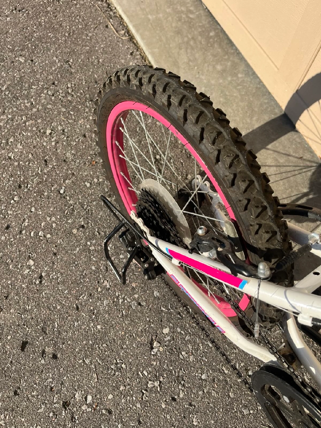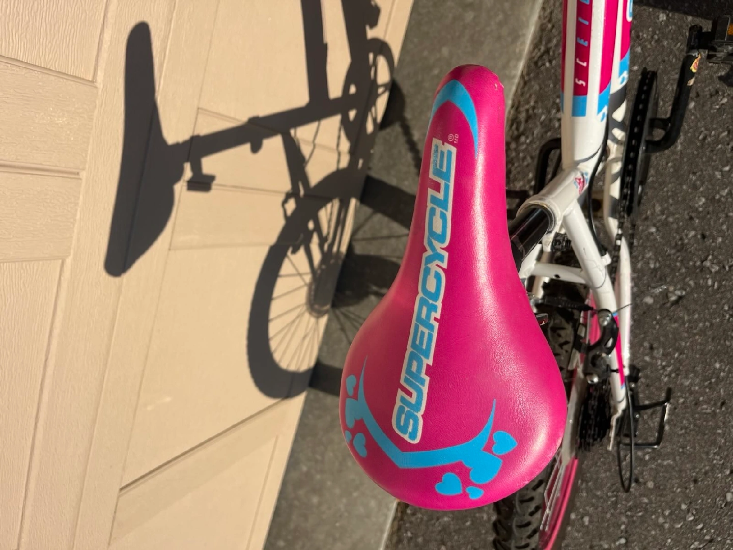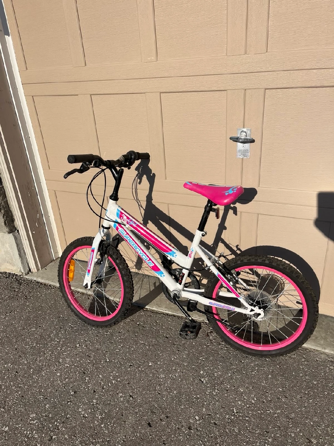 Selling a Supercycle Fly Girl 18-inch bike. It's white with pink accents and in good condition! Perfect for a young cyclist.