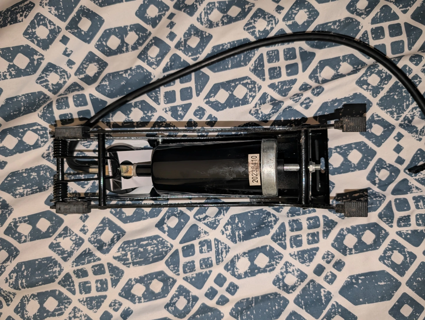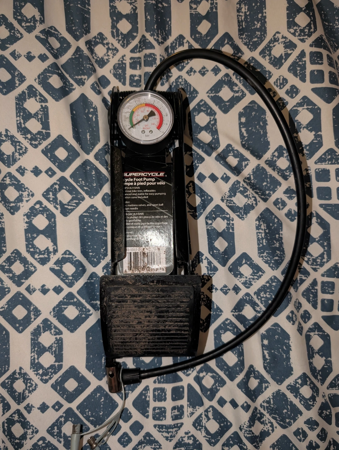 15Foot pump with pressure gauge. Durable construction. Long hose. Great for inflating bicycle tires.