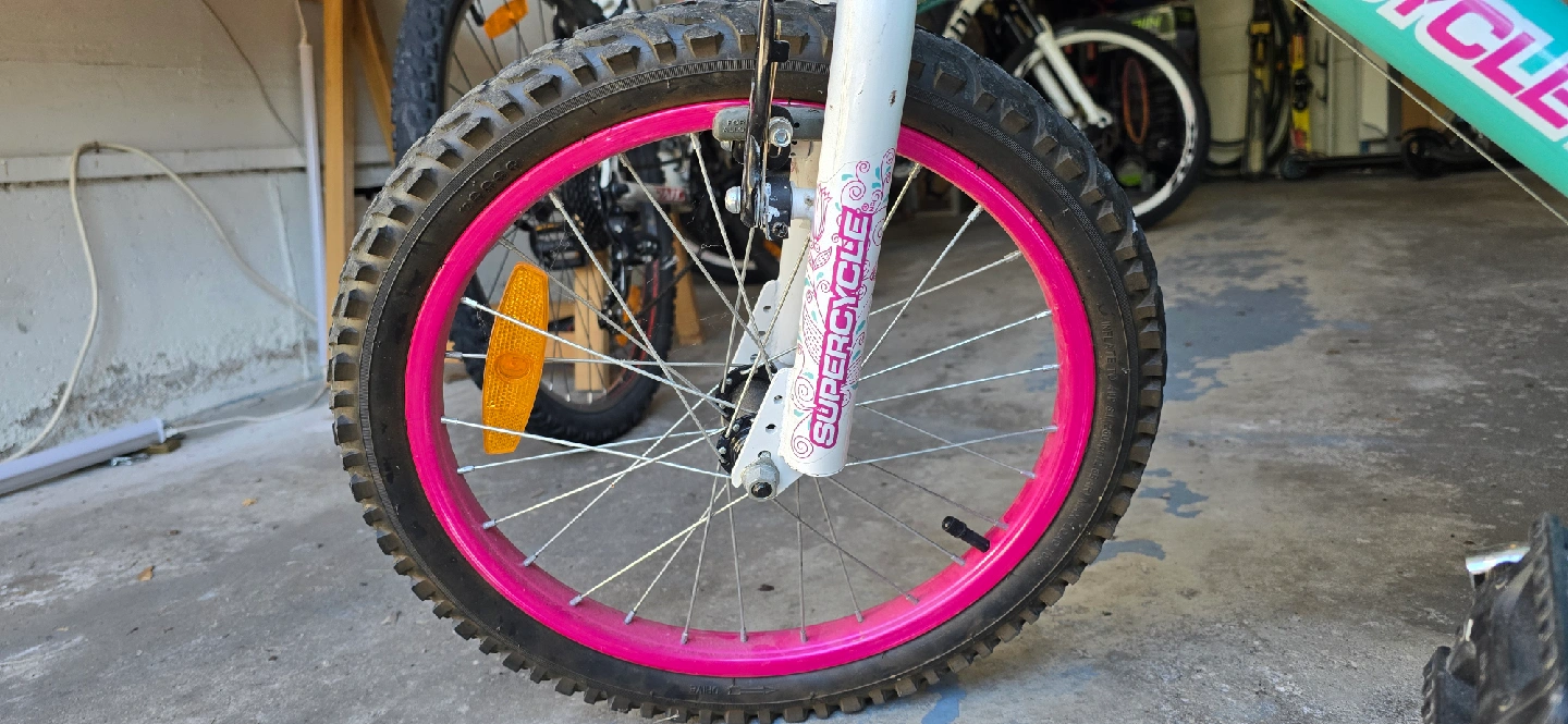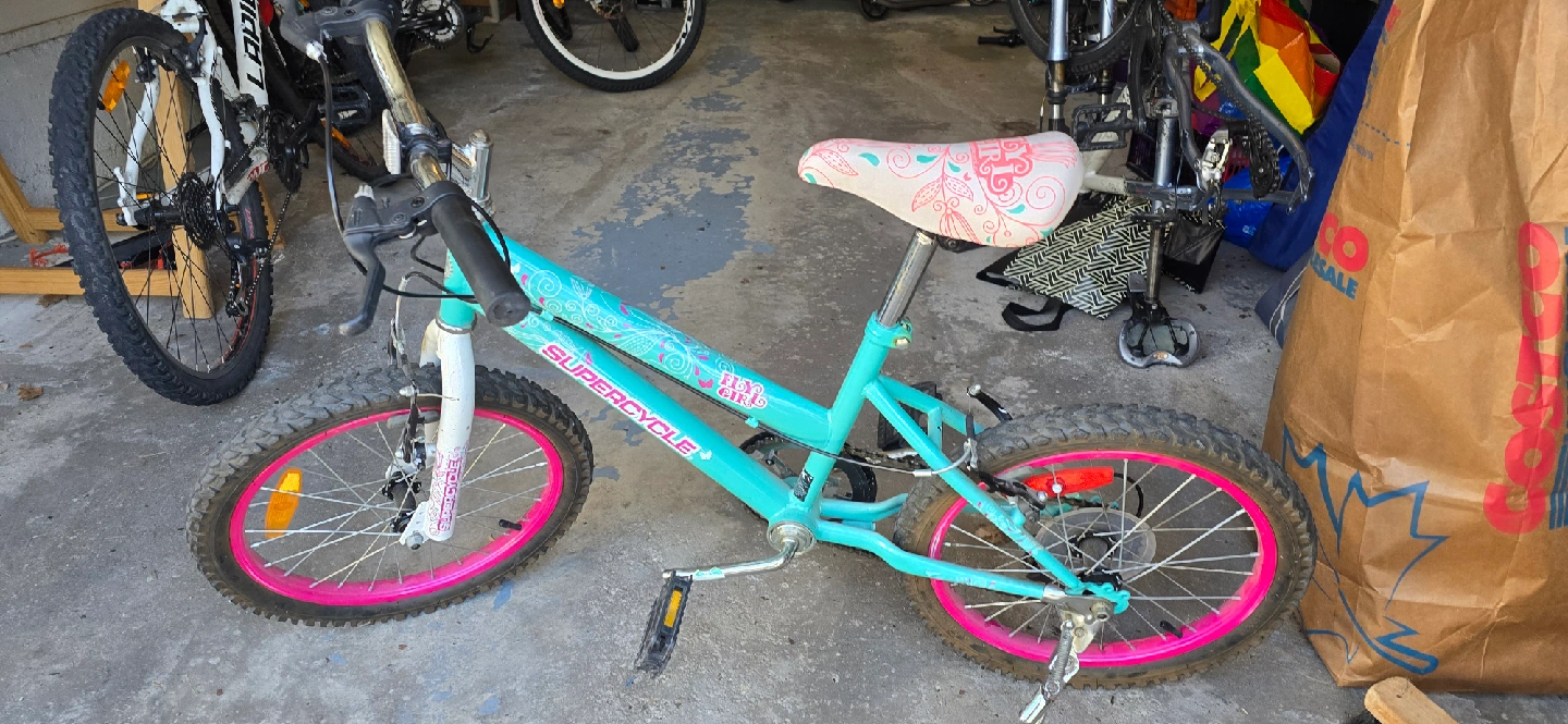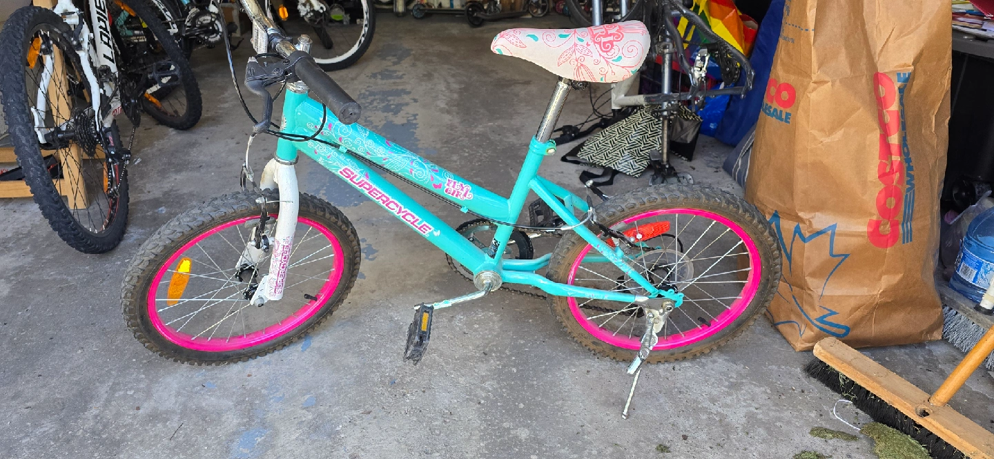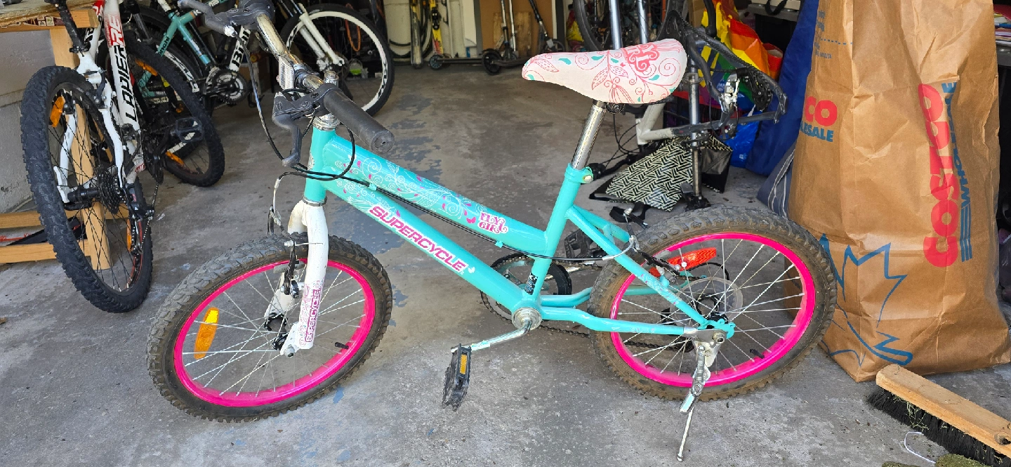 Selling a Supercycle Lily Girl's bike in turquoise! It's a cute bike with pink rims and a patterned seat. Perfect for a young girl in good condition