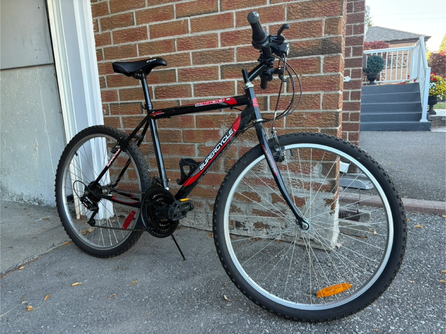 80Selling a Supercycle mountain bike. It's black with red accents and in good condition. Perfect for trails or getting around town!