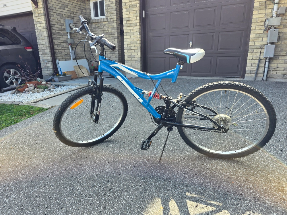 18Selling a blue Supercycle Vice Dual Suspension Mountain Bike with 26-inch wheels. It's in good used condition! Great for trails or just cruising around the neighbourhood