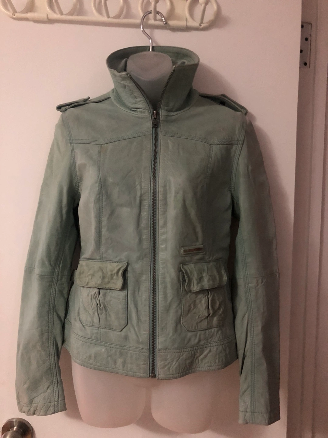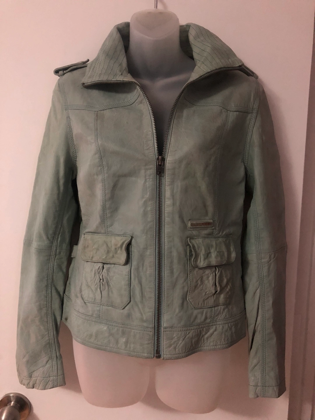 224Selling a Superdry leather jacket in a unique light green colour. The jacket features a collared neck and has multiple pockets. The size is M, but fits small please refer to the photos for measurements and condition