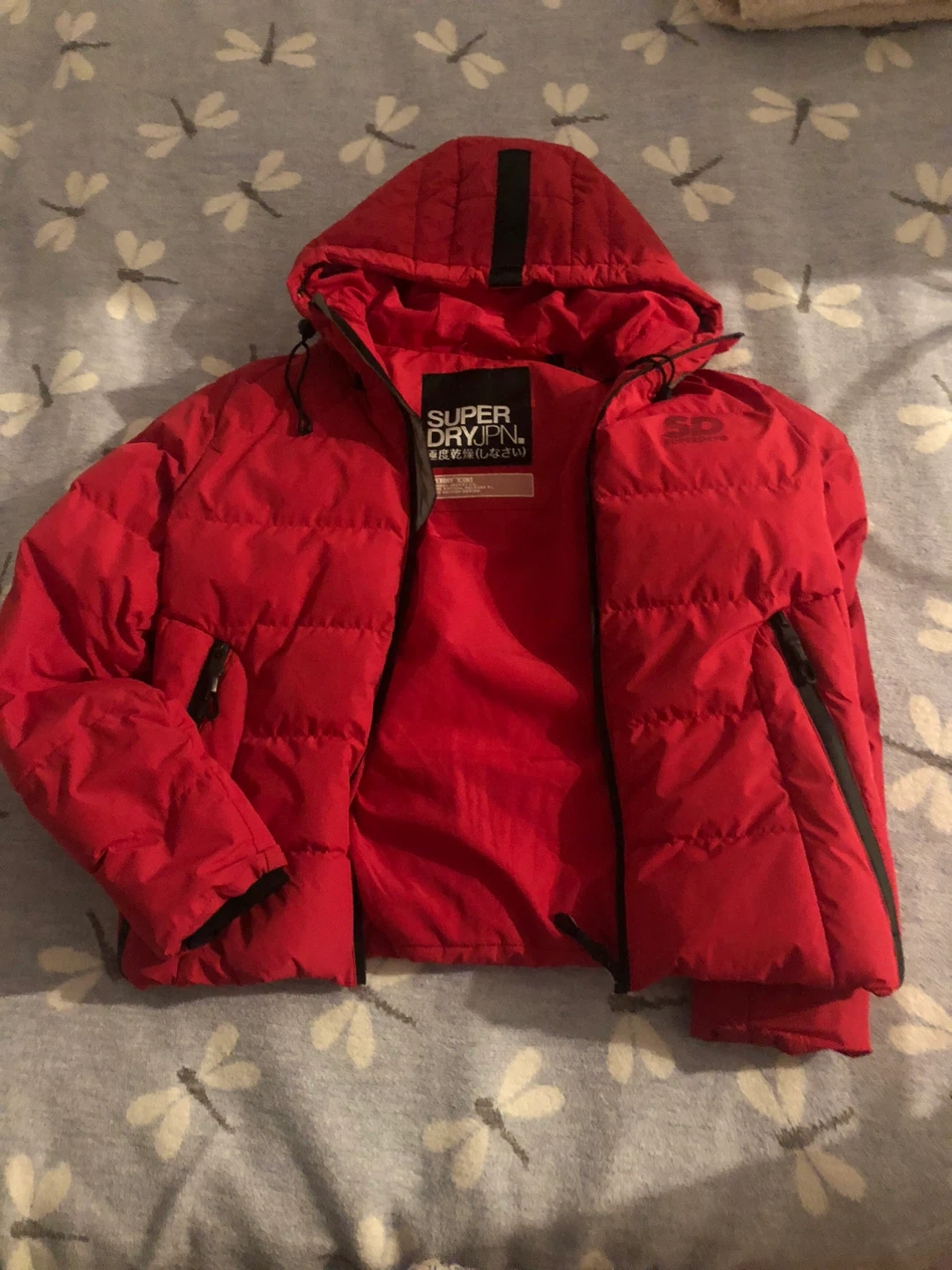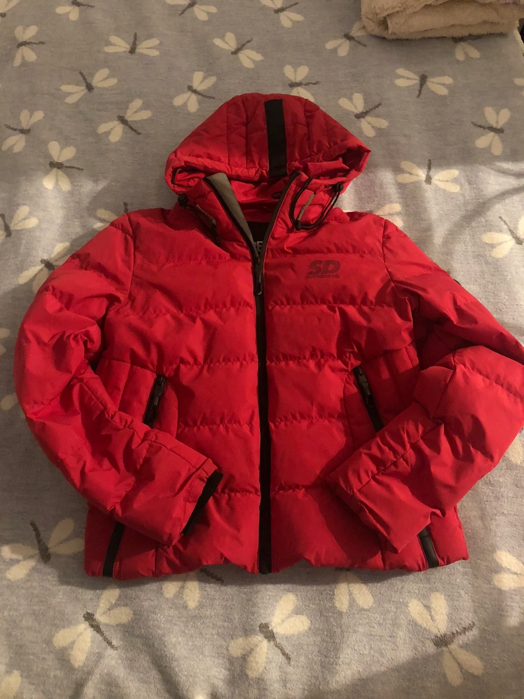 Selling a vibrant red Superdry puffer jacket! Ready to keep you warm this winter. The jacket features the classic Superdry logo.
