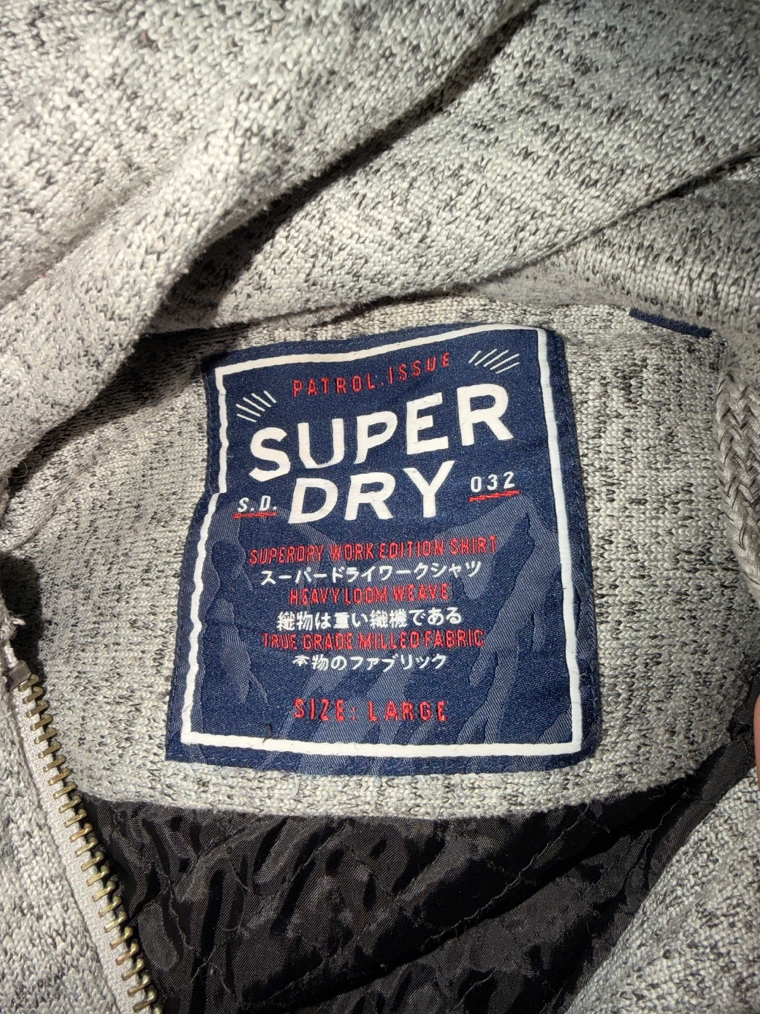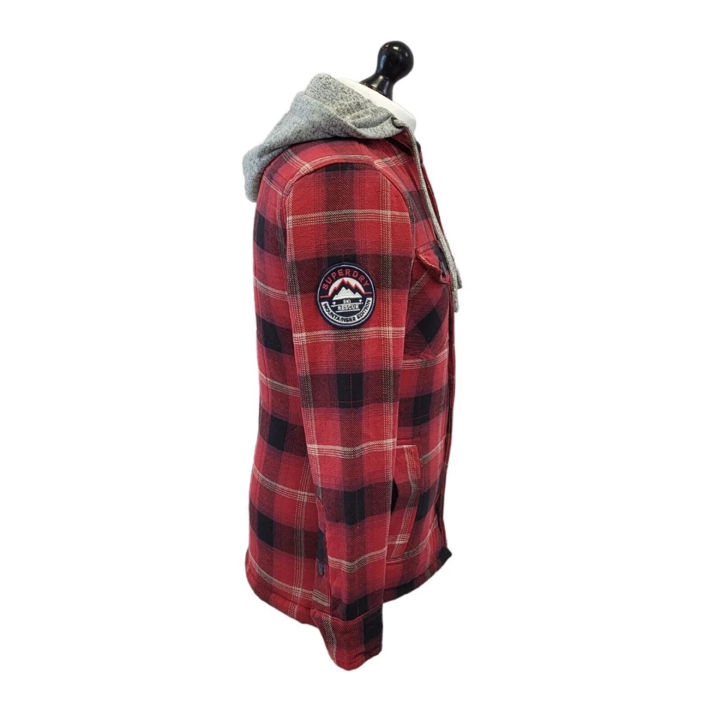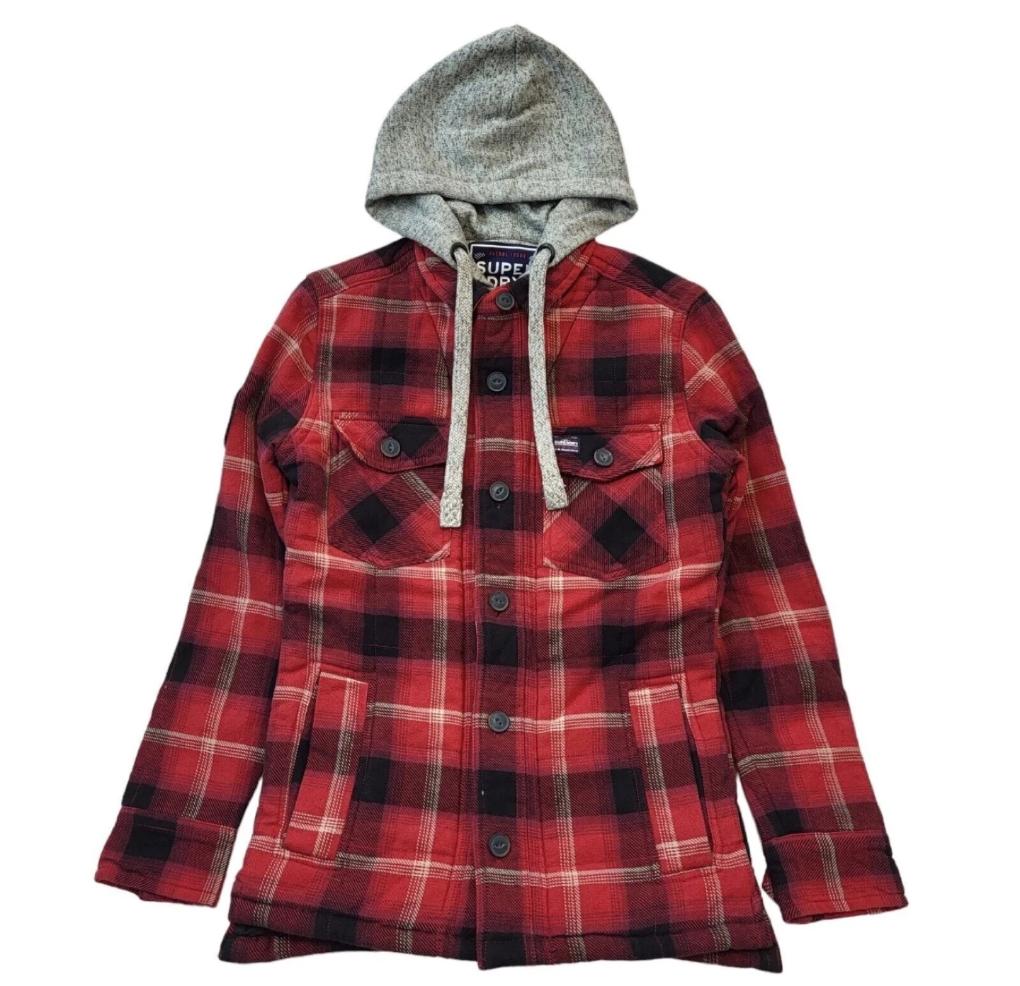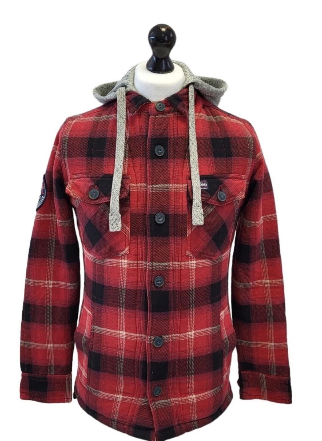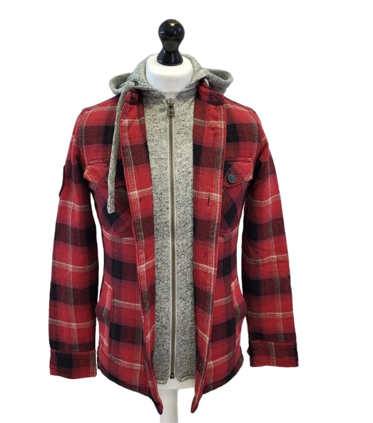 65Selling a Superdry Work Edition jacket in size large! It features a red and black plaid pattern. The jacket has a grey, knitted hood and a full zip. It's in great condition and ready for a new home