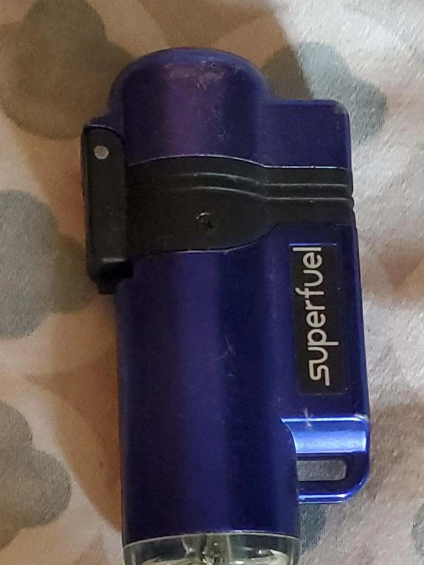 10Selling a blue Superfuel lighter. It shows some signs of use, as seen in the photos, but it's still functional. Perfect for anyone needing a reliable lighter!