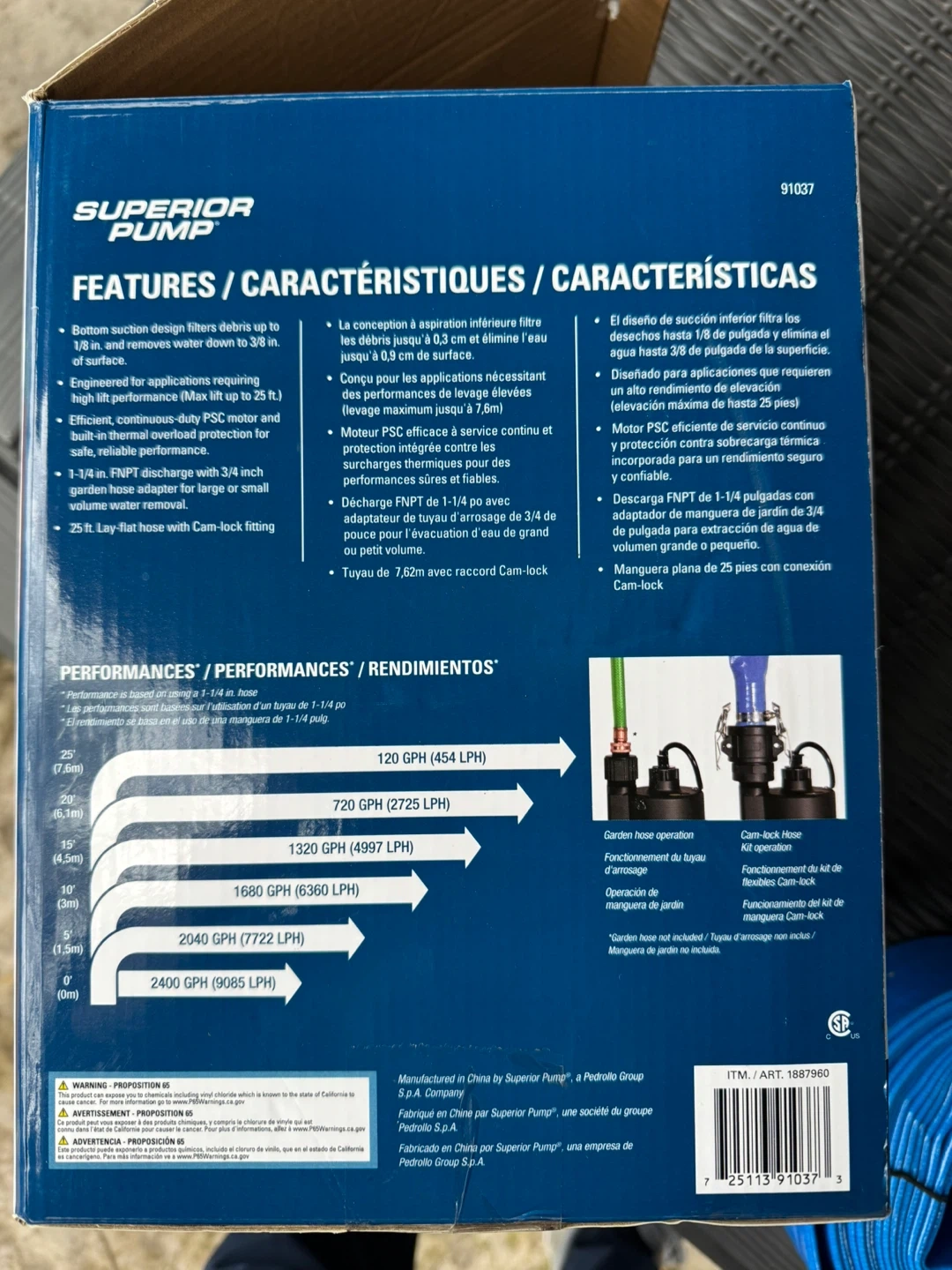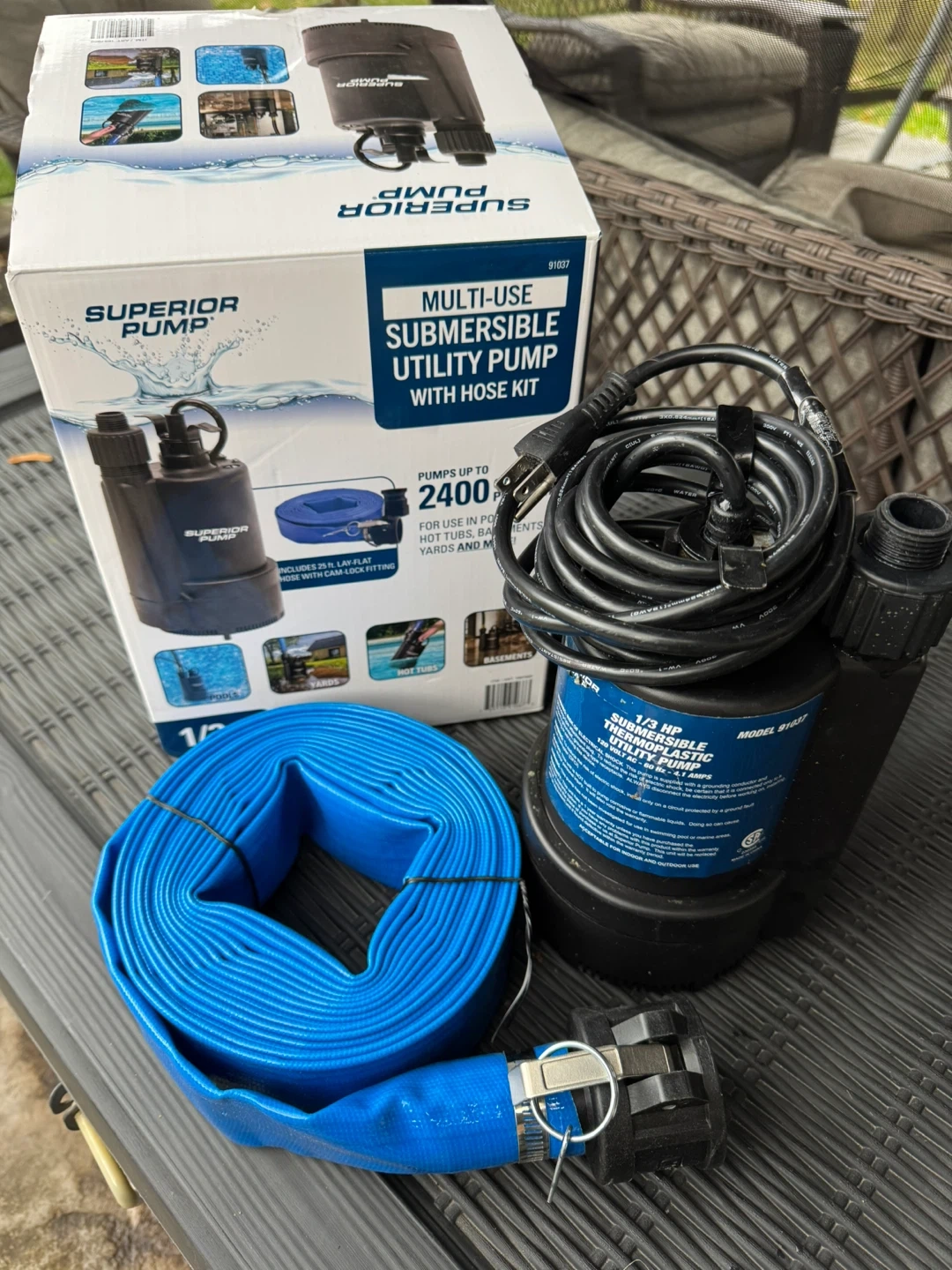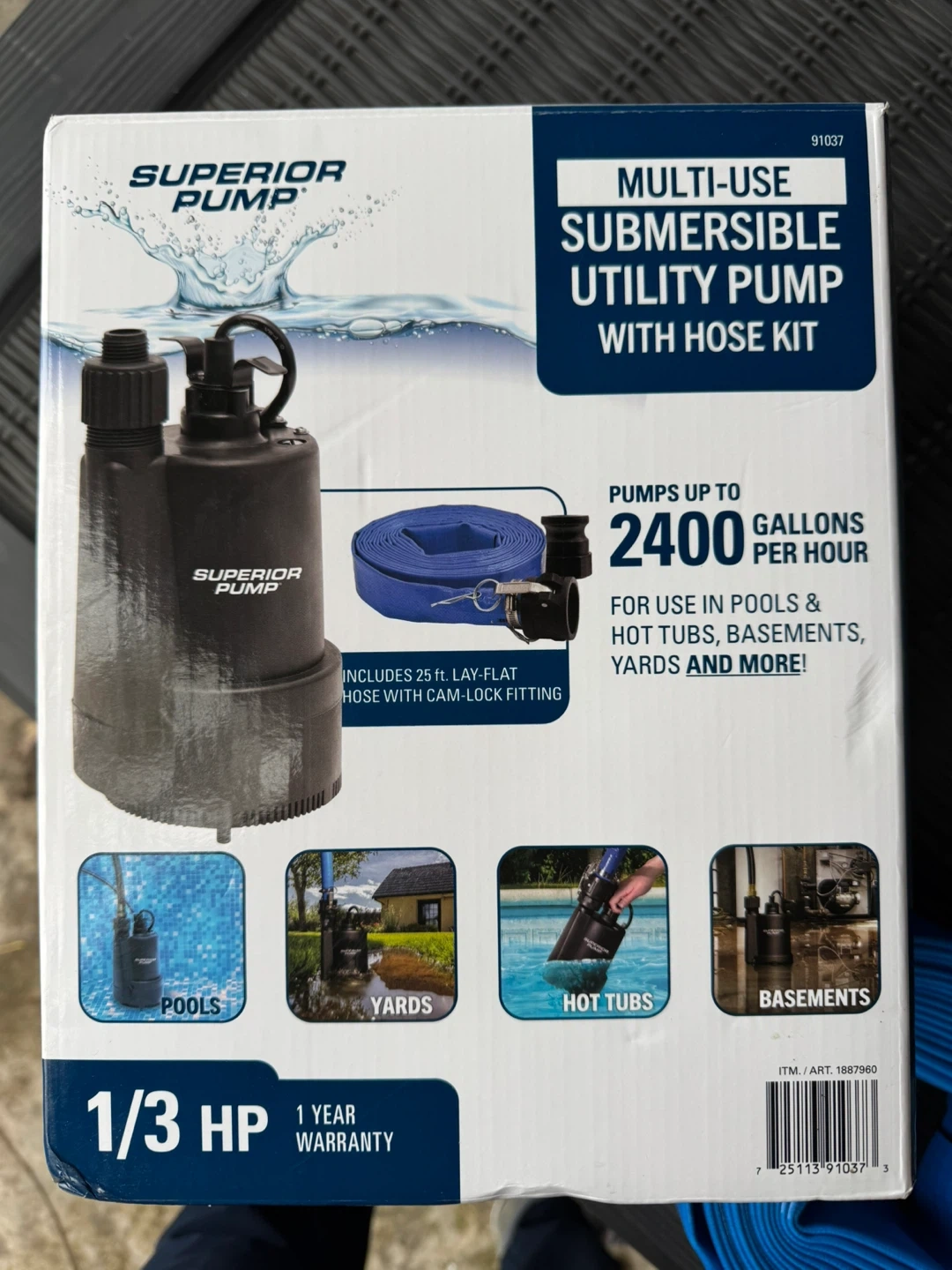 32This is a Superior Pump multi-use submersible utility pump, equipped with a hose kit, capable of pumping up to 2400 gallons per hour. It is designed for use in pools, hot tubs, basements, yards, and more. Only used a handful of times. * Pumps up to 2400 Gallons per Hour * Includes 25 ft. Lay-Flat Hose with Cam Lock Fitting (Brand New Never Used) * 1/3 HP Looking to efficiently remove water? This pump is ready to go whenever you are! If the ad is up, it's available!