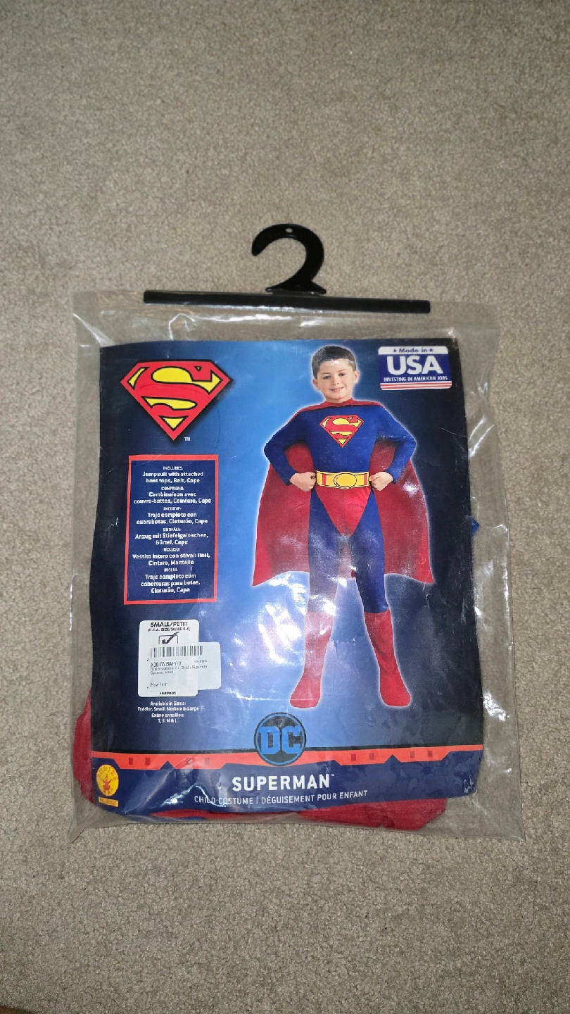 Selling a Superman child costume, size Small/Petit. The costume includes a jumpsuit with attached boot tops, a belt, and a cape. Perfect for Halloween or dress-up! All for $10