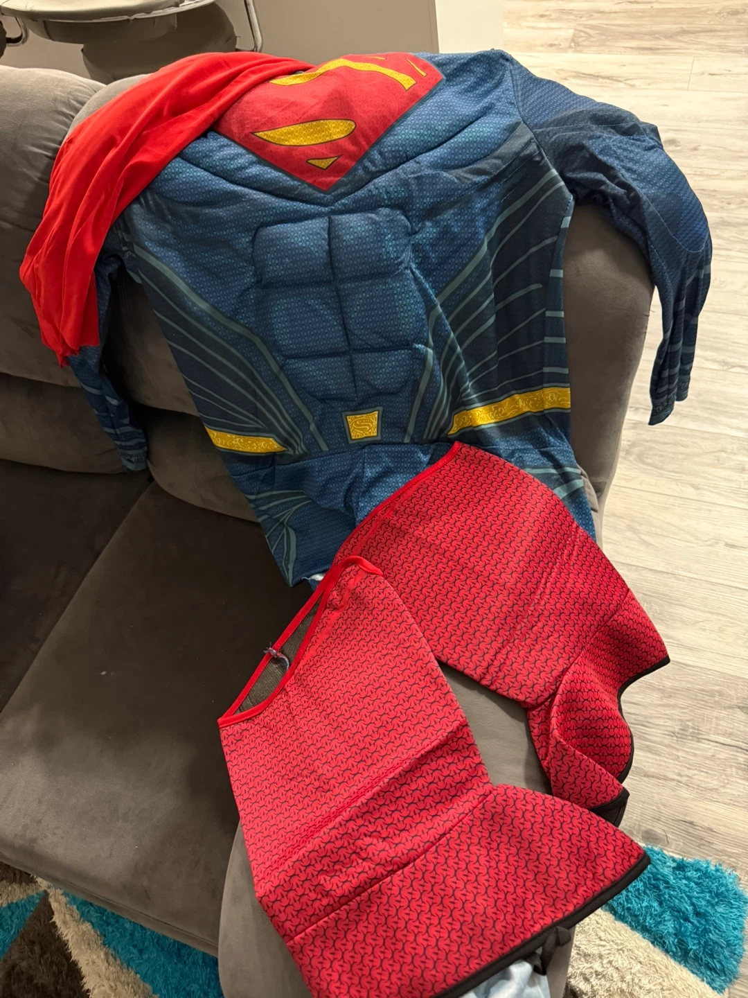 10Selling a Superman costume! It's in great shape and ready for your little superhero's next adventure or Halloween. Includes a blue costume complemented by red trunks, red boots, and a long, flowing red cape.