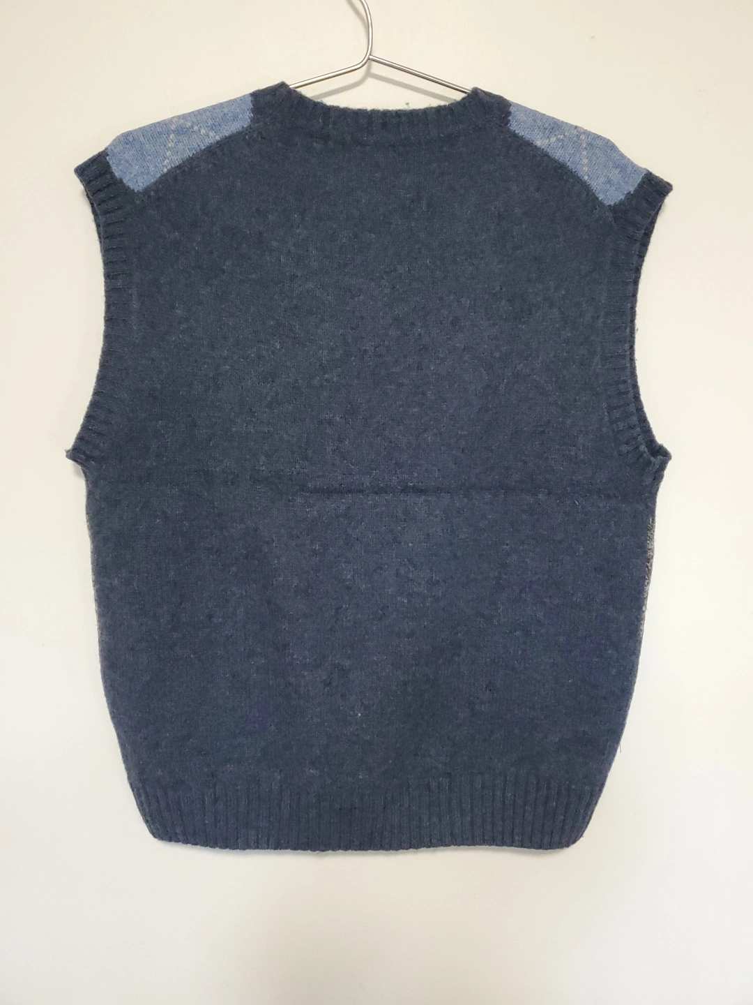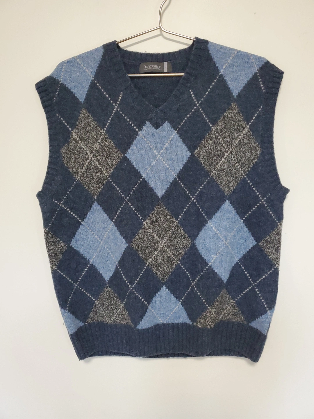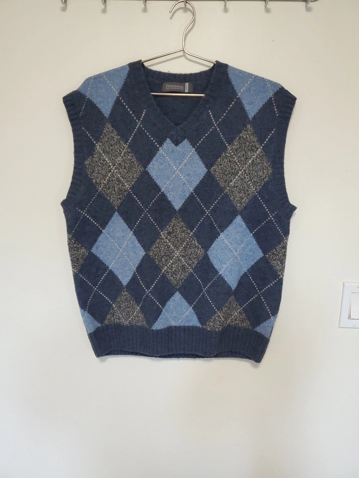 Cozy up in this 100% Wool stylish argyle vest! It's made from supreme soft Shetland wool, perfect for layering during cooler weather. The vest is a size L and features a classic V-neck design. Hand wash in lukewarm water or dry clean for best care