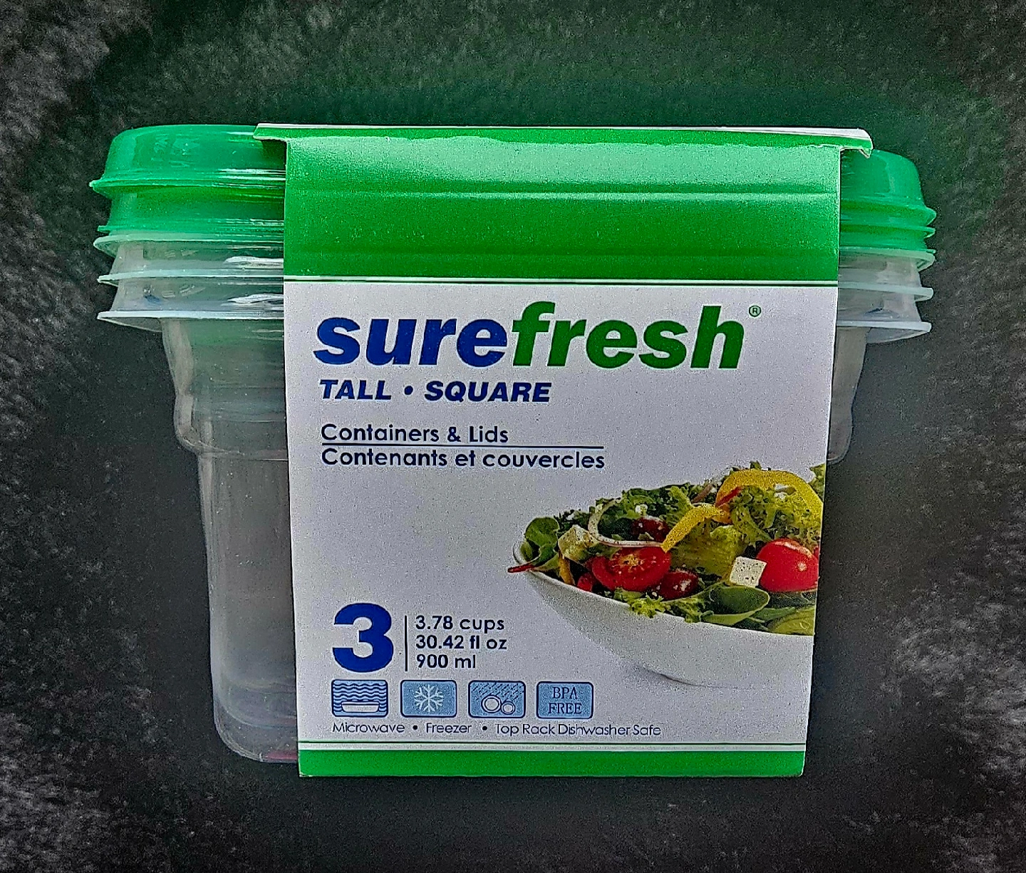 Selling a set of 3 Sure Fresh Tall Square containers with lids! They're microwave, freezer, and top-rack dishwasher safe. Each container holds 3.78 cups (30.42 fl oz / 900 ml). Perfect for storing leftovers or meal prepping! From a smoke-free, pet-free home. Bundle discounts are available—feel free to browse my other listings. Thanks for looking! 😊🙏