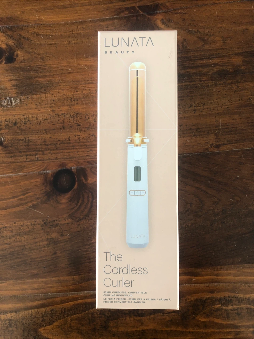 This is the Lunata Beauty cordless curler with a 32mm titanium barrel. It converts to a traditional curling iron and includes a heat-proof sleeve and charging cable. It reaches up to 450 degrees Fahrenheit with multiple heat modes. The box is a little worn but the curler has never been used.