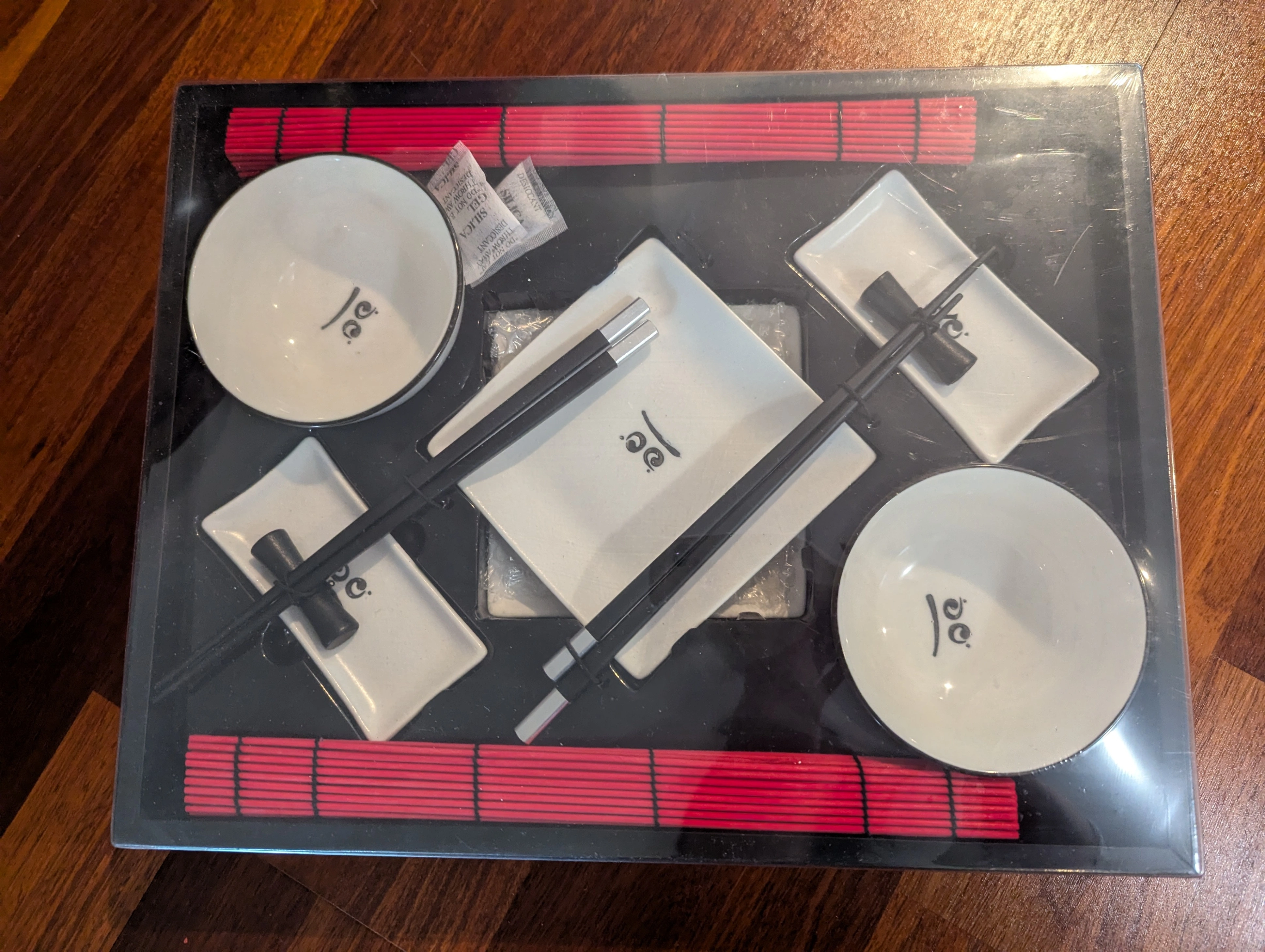 New packaged in box. Dinnerware set (bowl, plate, soy sauce plate, chopstick holder with chopsticks) for 2.