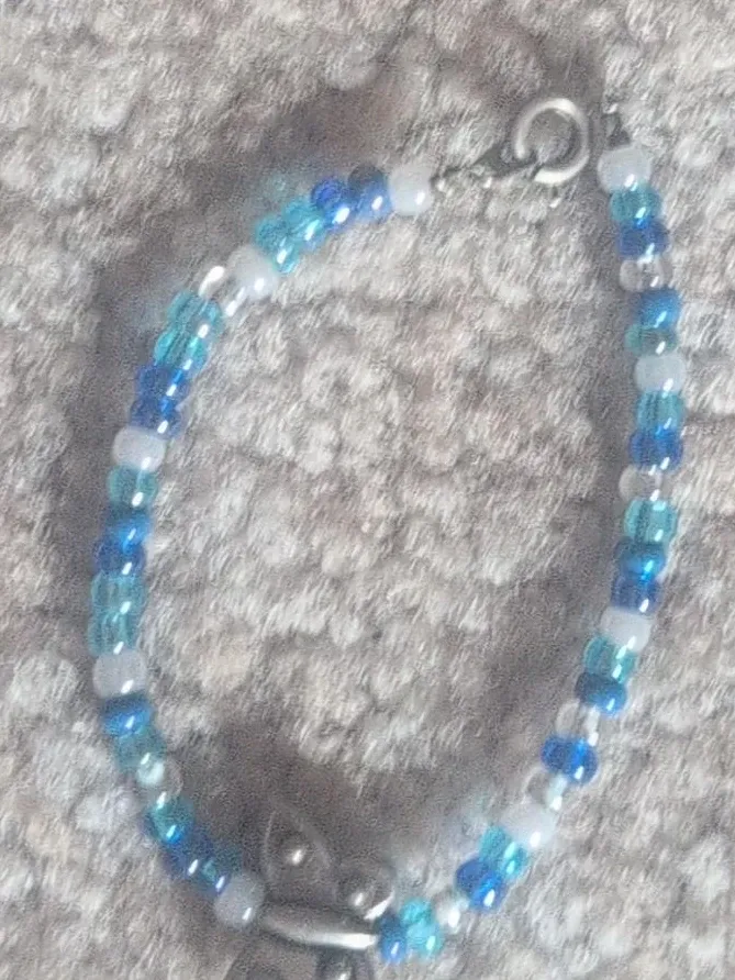 This is a handmade beaded bracelet featuring shades of blue and white beads. It's accented with a silver-tone butterfly charm and a clasp closure. Perfect for adding a pop of colour to any outfit!