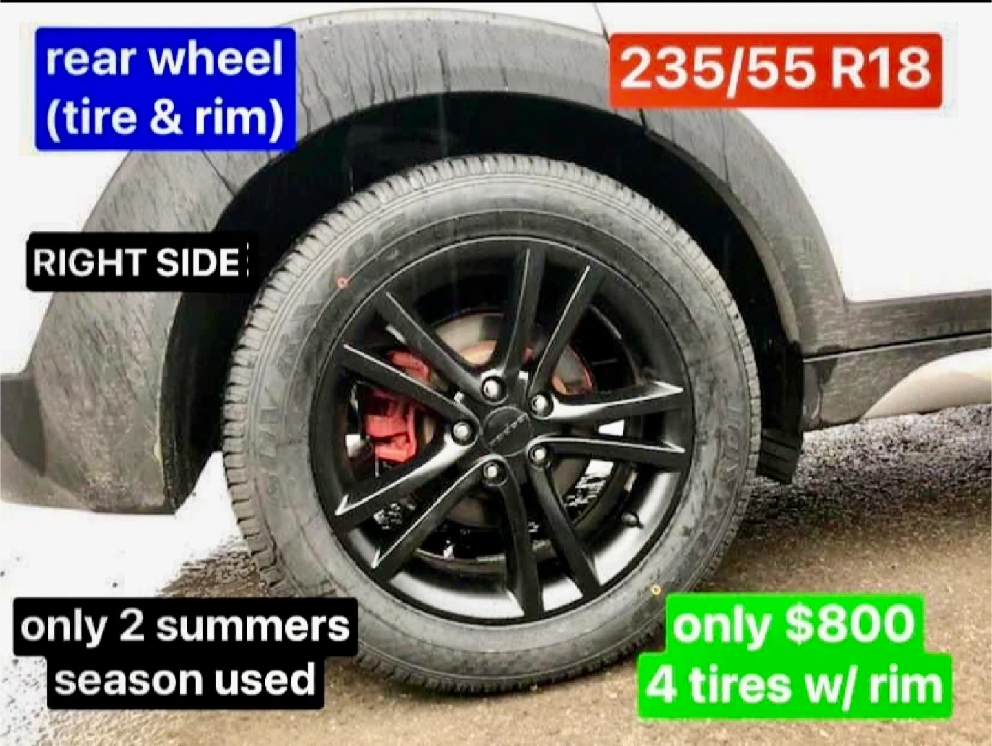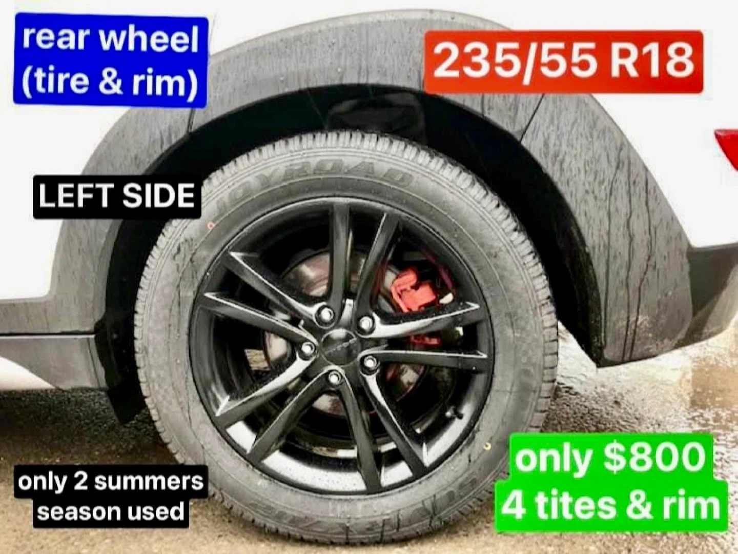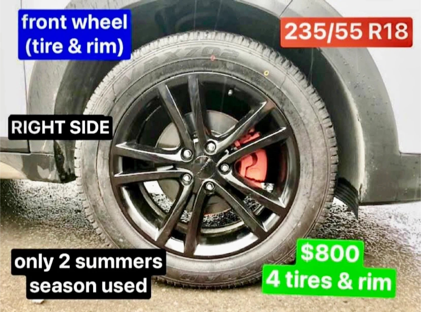 Set of 4 all-season SUV tires (235/55R18 Joyroad RX702) with 18” rims, used 2 summers. Good condition, fits SUVs with 5 bolts, 114 mm bolt pattern. Smooth, durable, and ready for all-season driving. $600 CAD, flexible for reasonable offers, but please no offers below $500