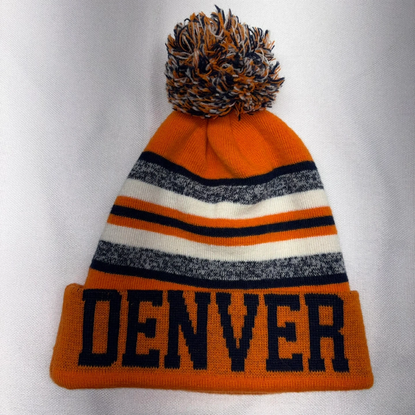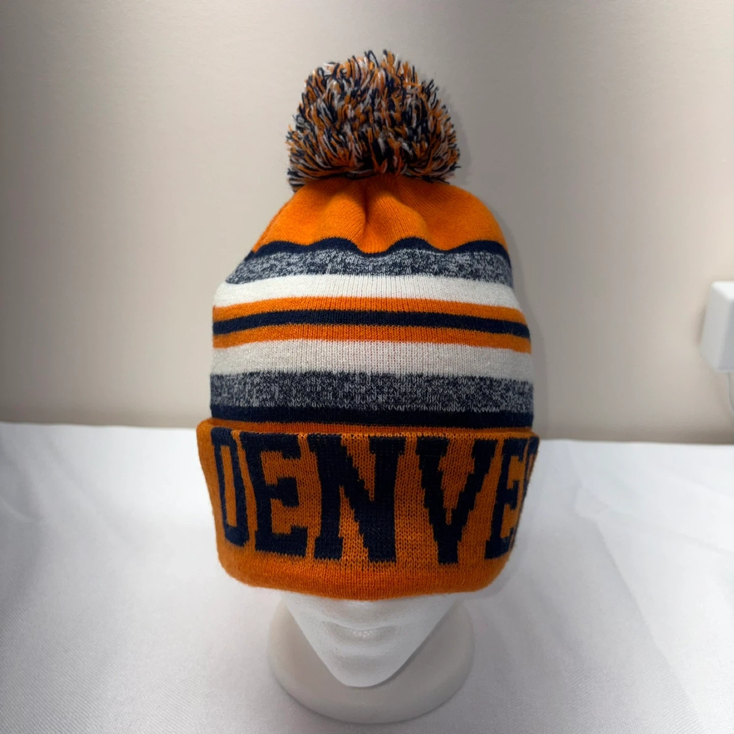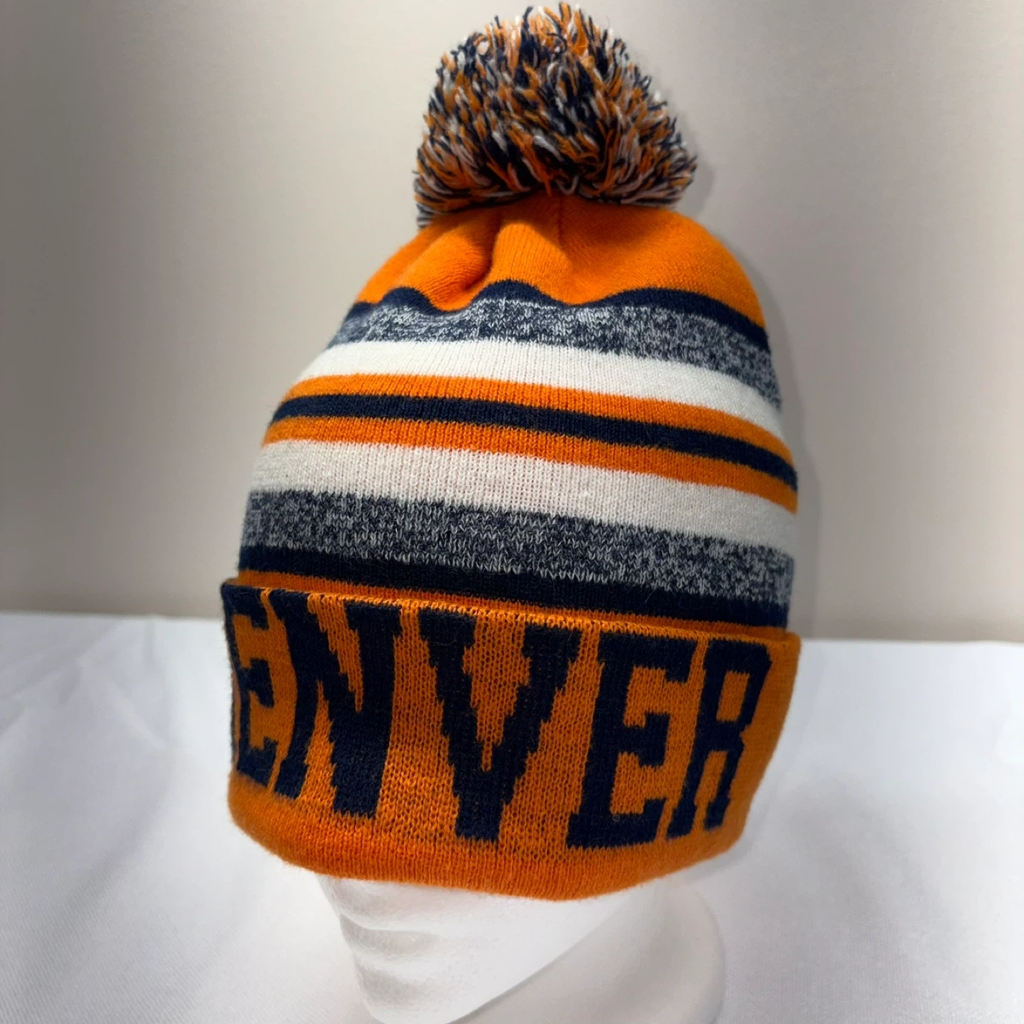 This is a cozy, striped beanie with a pom-pom. It says 'Denver' on the brim. Made from 100% acrylic material, it's perfect for keeping warm during cooler weather.