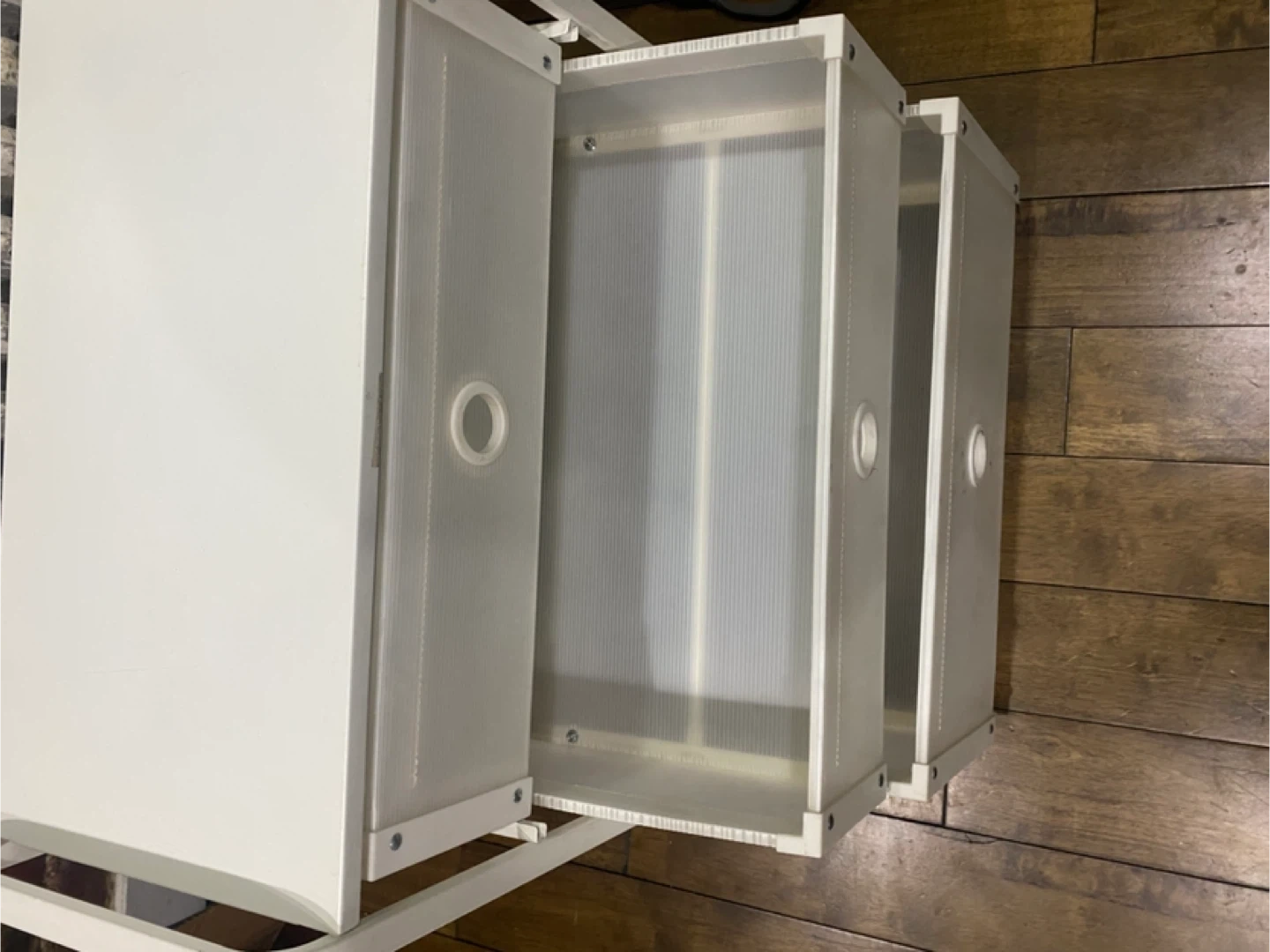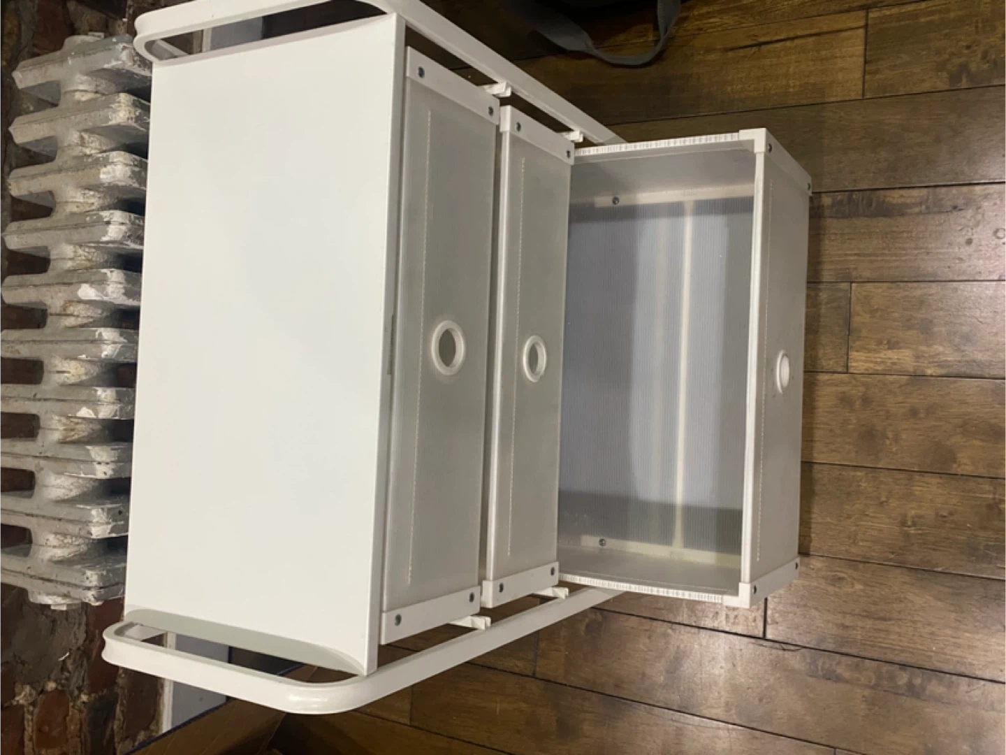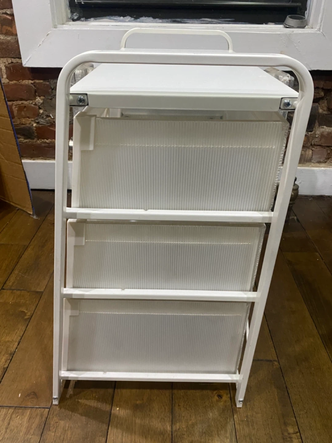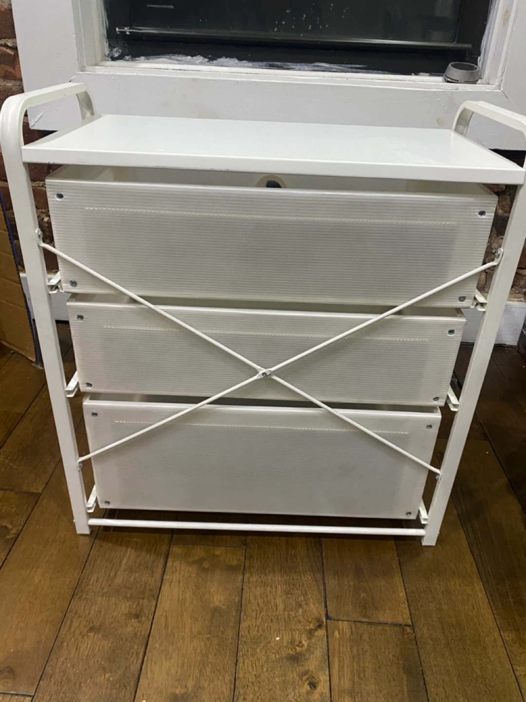 This white storage stand comes with three drawers with a frame that’s made of metal. Originally from IKEA. The drawers are a translucent plastic material. Well loved, but still sturdy and spacious!