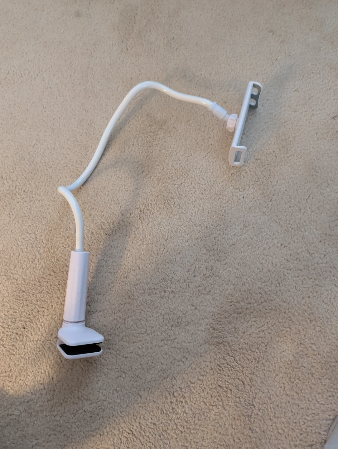 Flexible gooseneck holder with a clamp base and a phone/tablet grip. Perfect for hands-free viewing or use on a desk, bed, or table. Easy to adjust into any position!