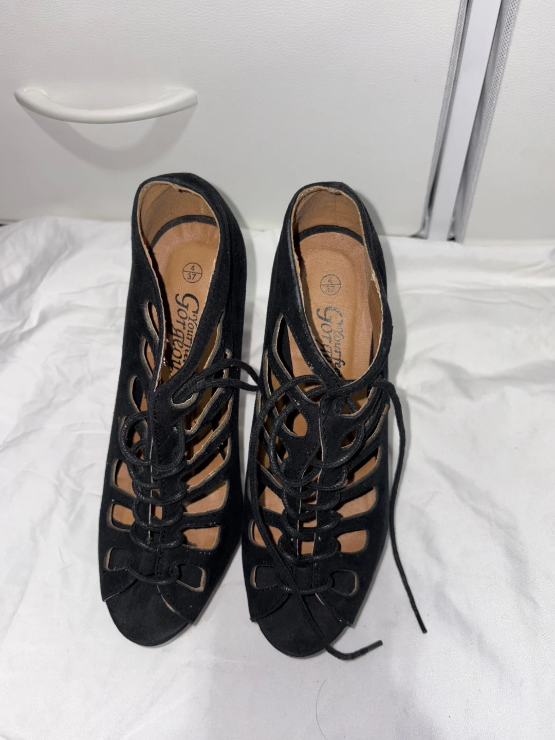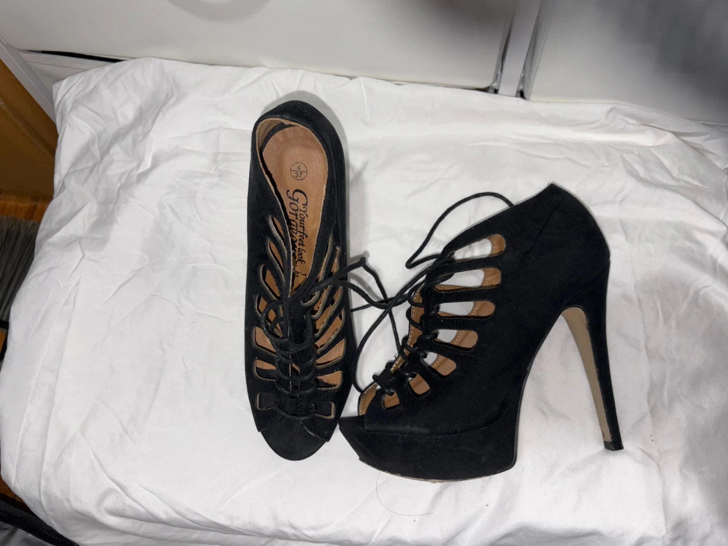 Gorgeous black suede lace-up platform heels. These shoes feature an open toe and intricate cut-out details. Heel height is approximately 5 inches.