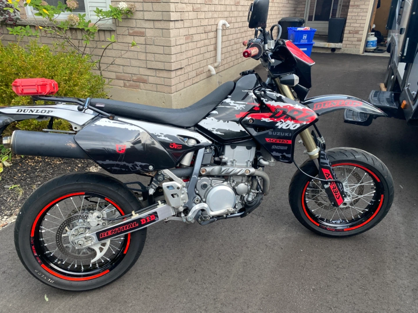 2007 DRZ 400 SM. All stock other than the seat concepts seat. Shift leaver and grips. Bar ends and hand protectors. Tires have about 200km on them, new air filter and brake pads come with it but not installed. Chain and sprockets have 500km on them. USB charger. New battery this year. Graphics kit. 37000 km. Oil changes every 500 km only because that’s about all I put on in a year so change oil every fall. No issues with the bike, valves adjusted about 1000 km ago. If the add is up it’s still available. I will throw in a tire balancing machine and a aluminum truck ramp. comes with cover. stored and kept in heated garage. This bike will not disappoint. Old guy driven (No stunting done with it). Keep in mind this bike never changed from 2001 to 2024. $4,000. Before I put it away for the winter. Price will go up in the spring.