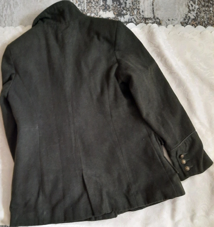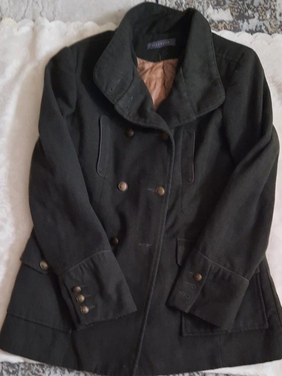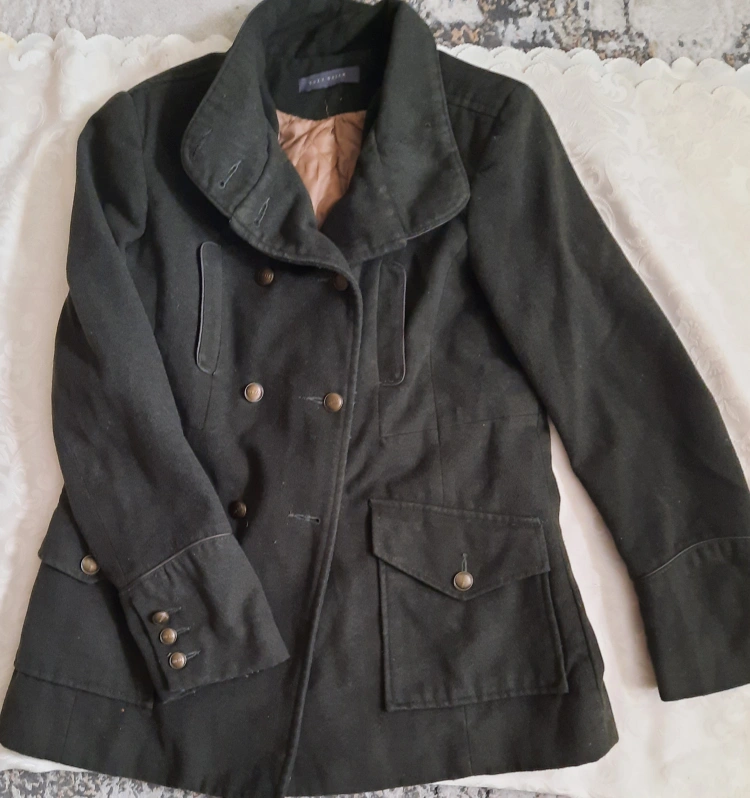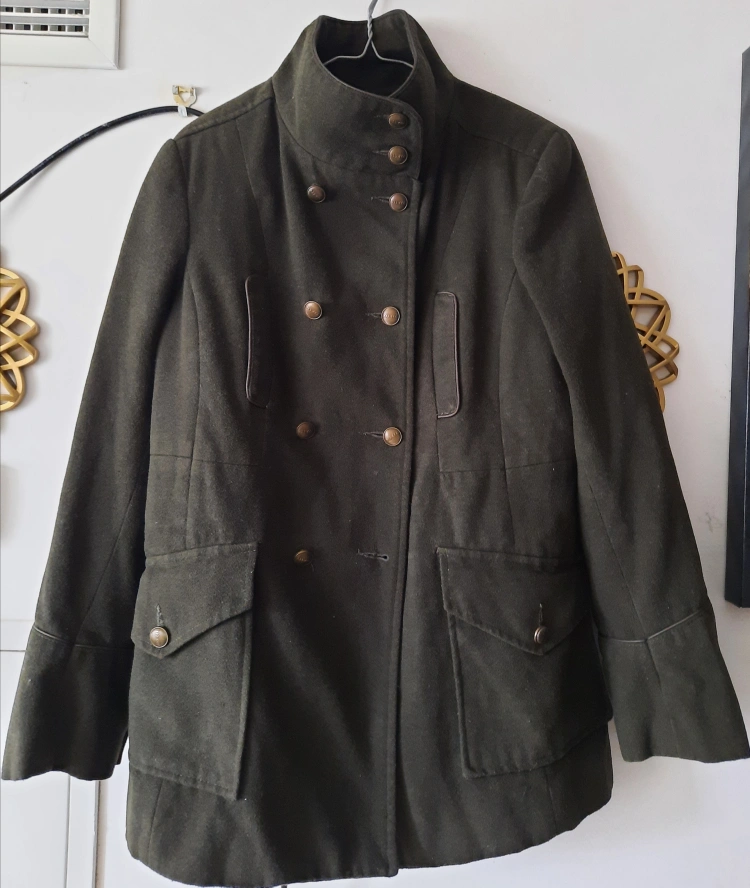 Women's dark green peacoat. Double-breasted with gold buttons. Features a mandarin collar and flap pockets. Long sleeves with buttoned cuffs. Missing buttons on cuff Smoke free and pet free home