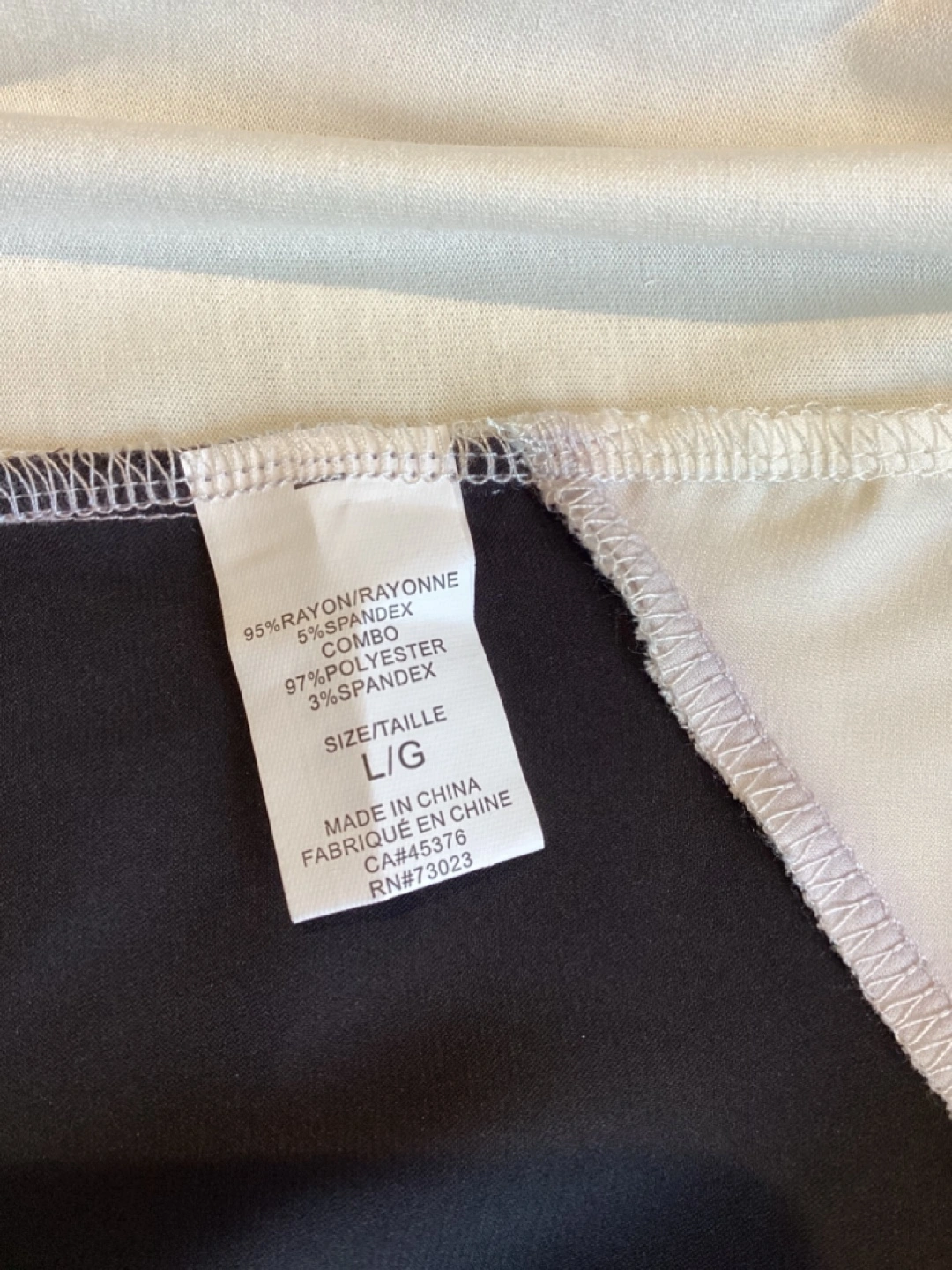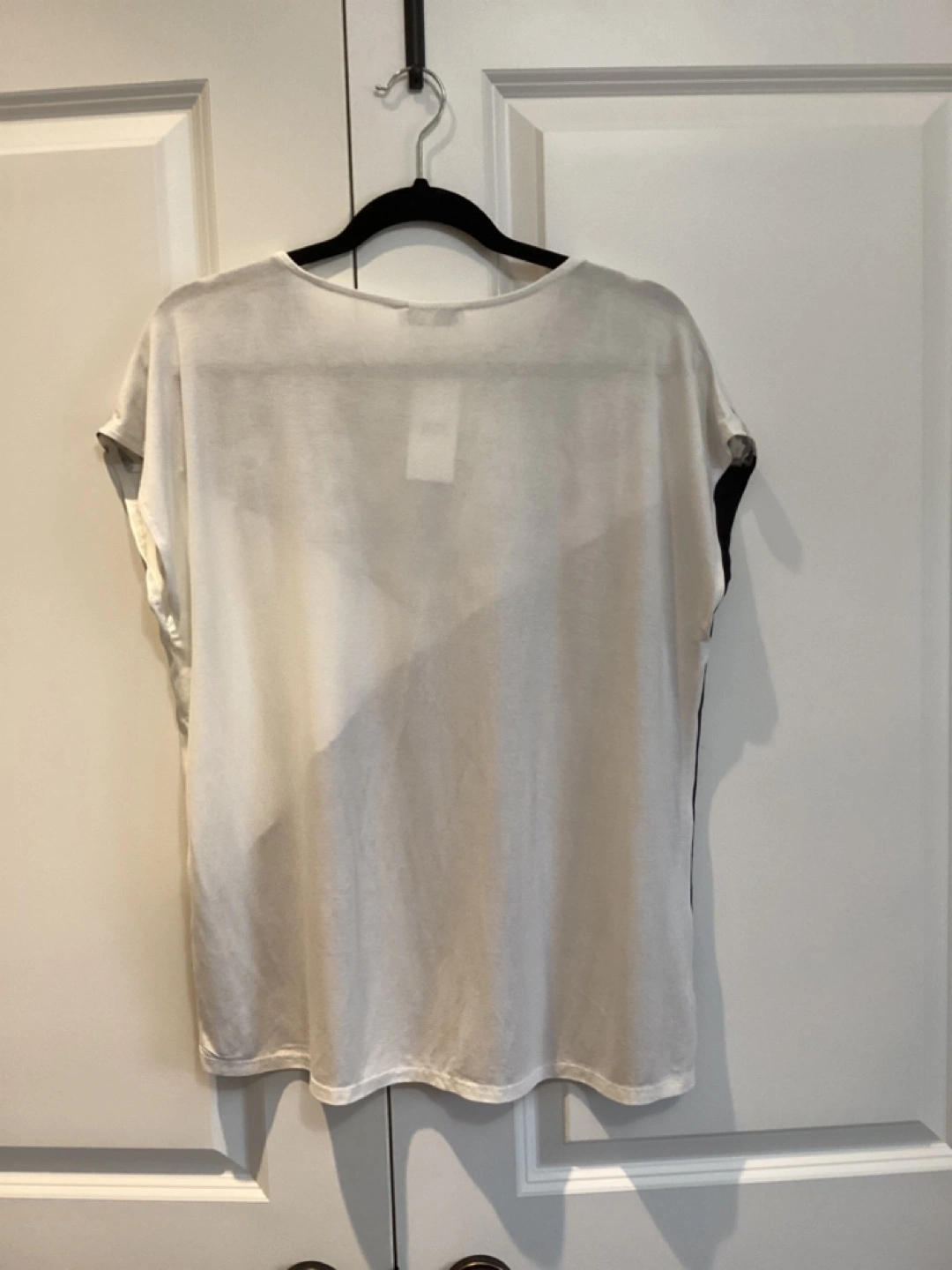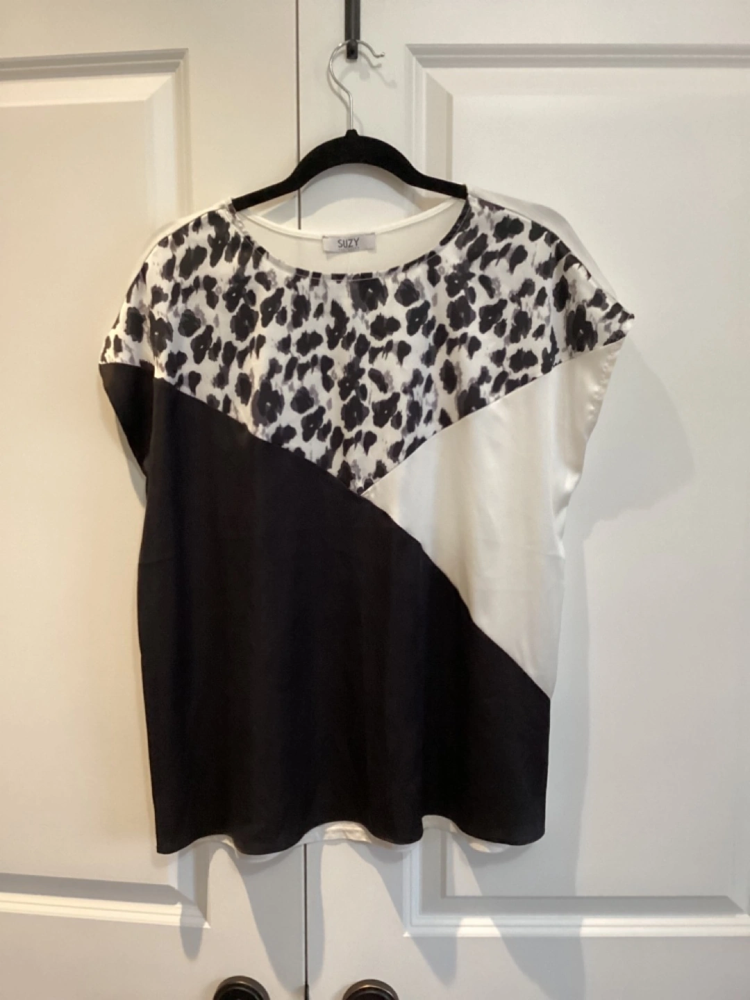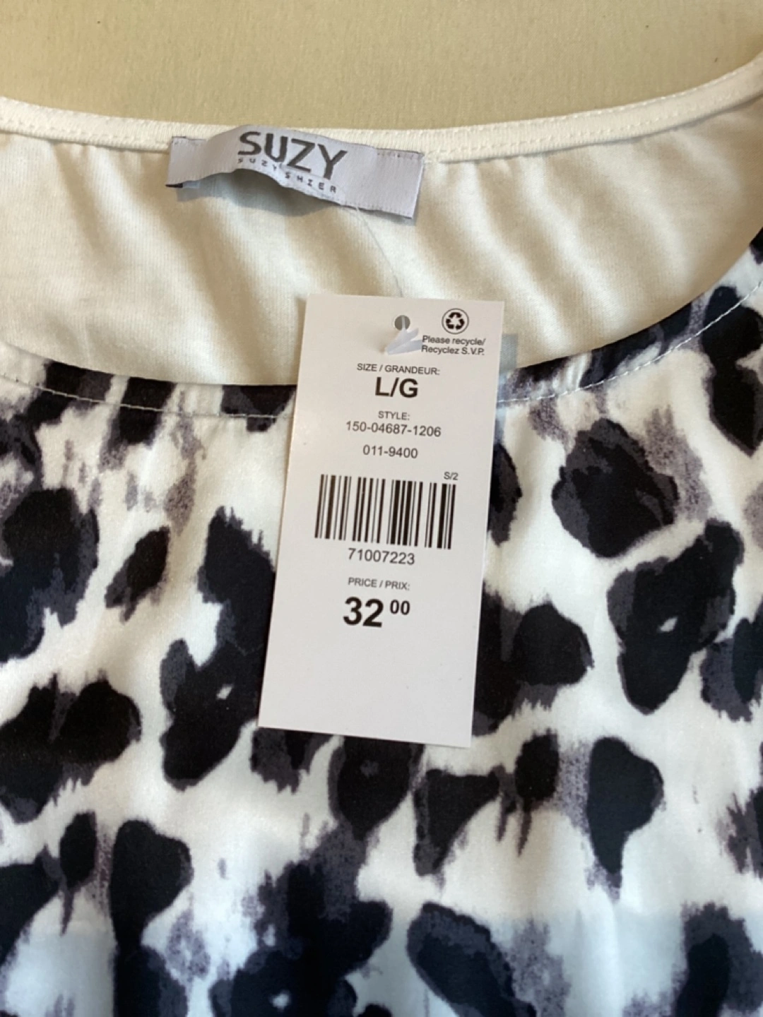 207Suzy Shier Top, brand new, neutral colours, knit back, Size Large, $8 Chest 46” Bottom width 46 1/2” Centre back length 25”