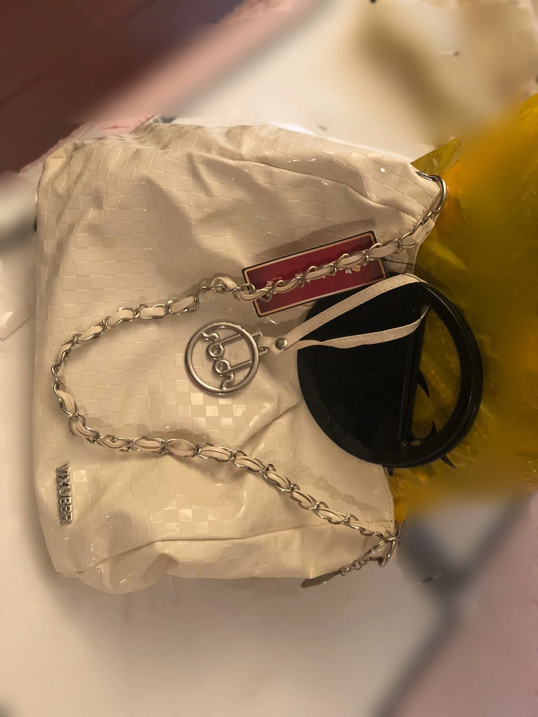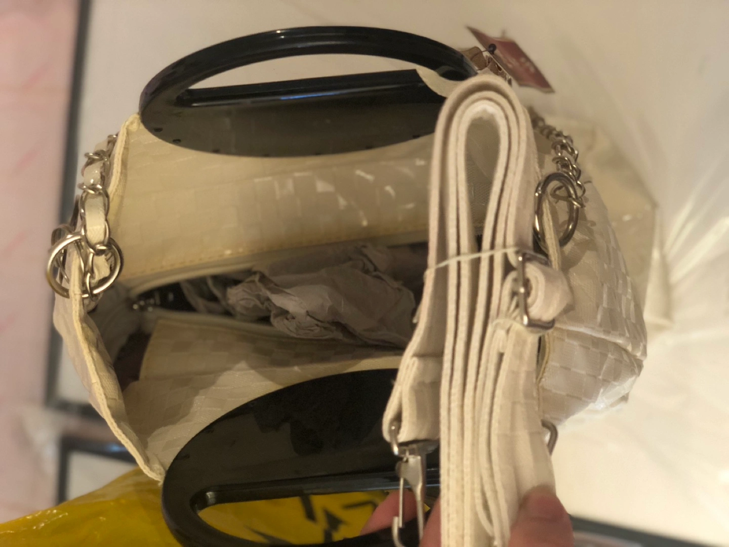 White handbag with a chain strap and a black circle handle. It has a removable strap, which can be adjusted to different lengths.