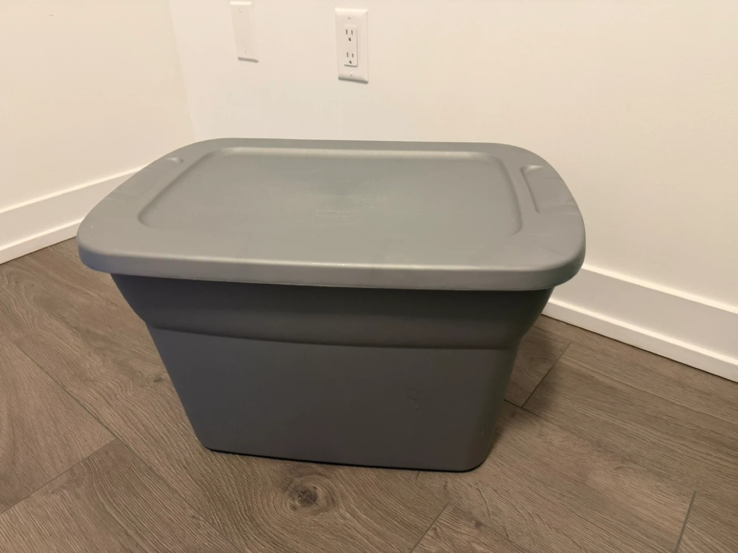 Grey plastic storage bin with a matching lid. It's a sturdy container for organizing various items. Perfect for tidying up spaces in the home or garage.