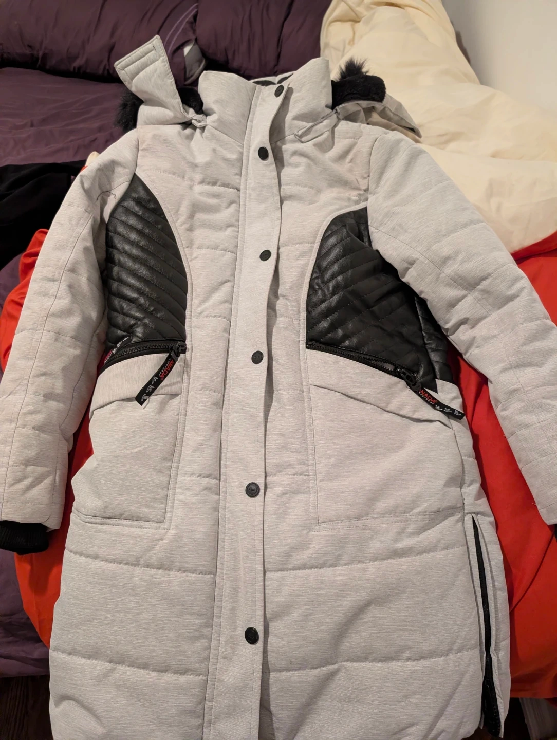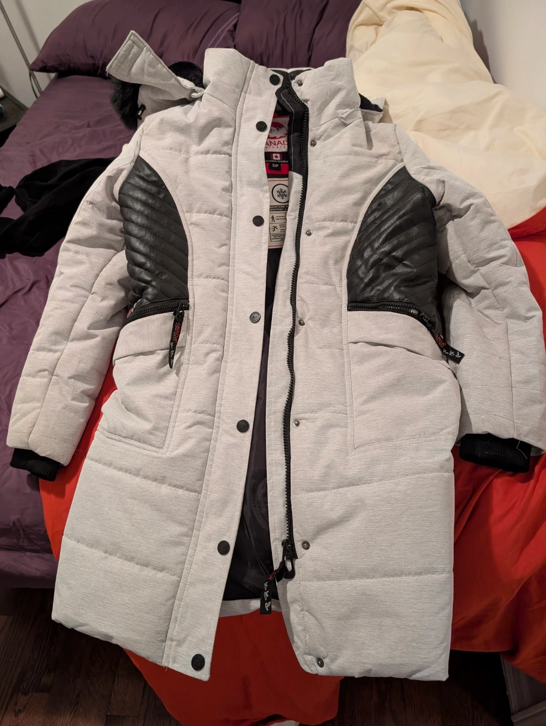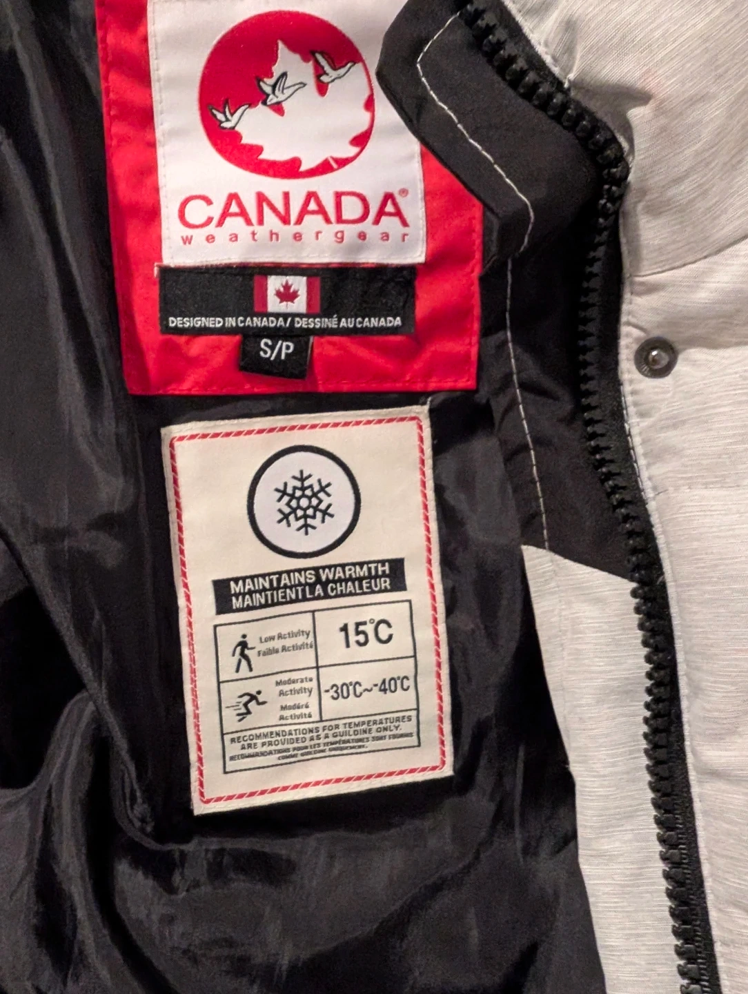 This Canada Weathergear winter coat is designed to maintain warmth. It's a size S/P and features a stylish light grey exterior with black quilted panels. This coat is suitable for keeping warm in colder weather.