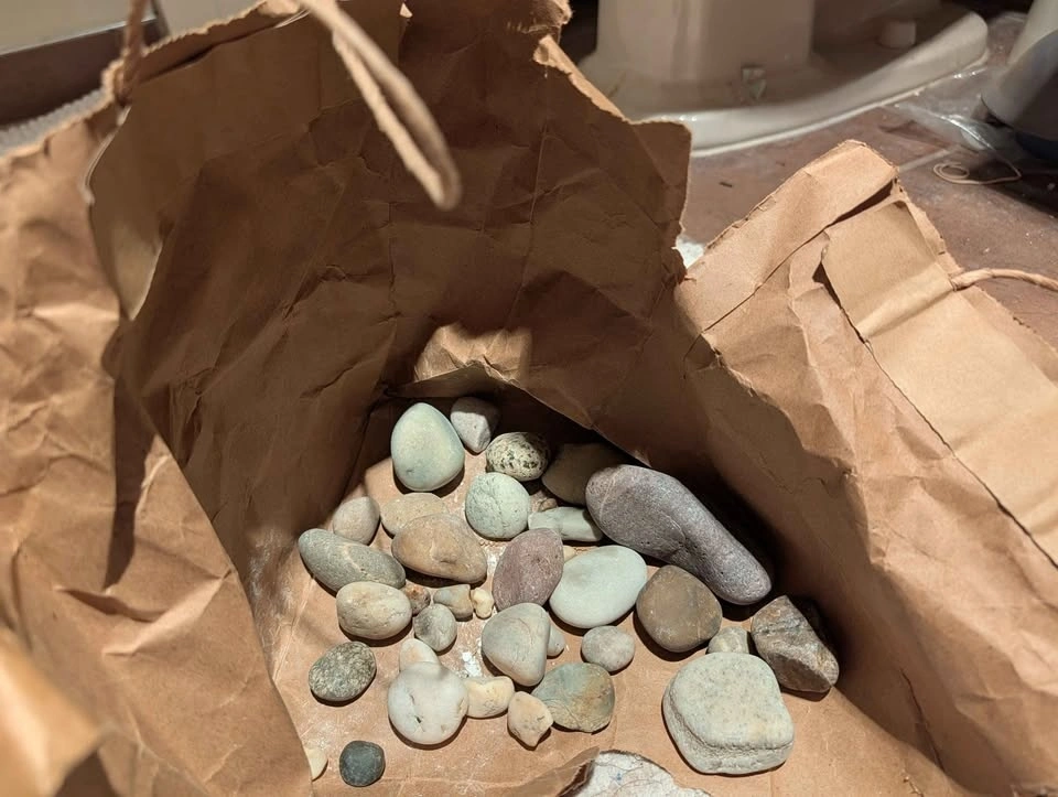 Mostly common beach pebbles, primarily sandstone, siltstone, quartzite, and a few pieces that appear to be granite or milky quartz. I just picked them up randomly whenever something looked fun, oddly shaped, or slightly different in color. Free if you can bring me some interesting junks.