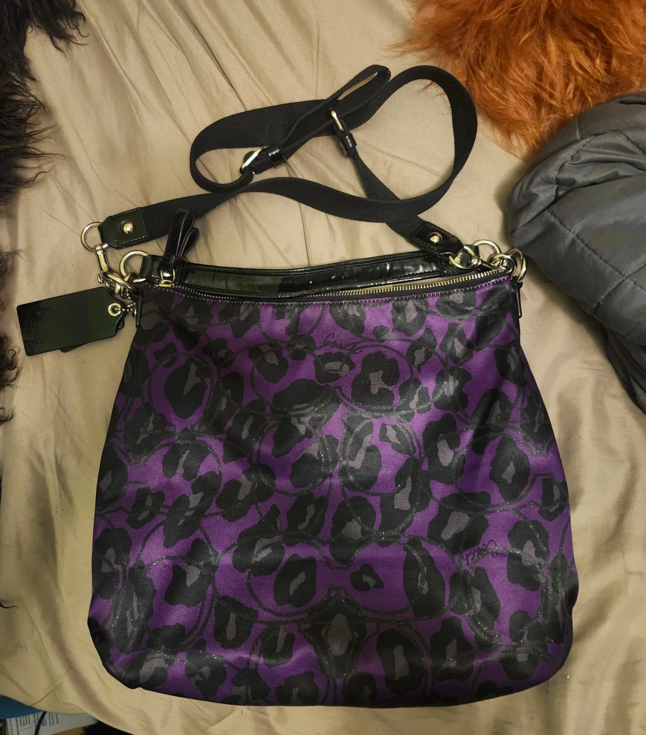 This is a Coach shoulder bag with a vibrant purple and black leopard print. It's made with a durable fabric and features a zippered main compartment and an exterior zippered pocket. The adjustable strap ensures a comfortable fit.