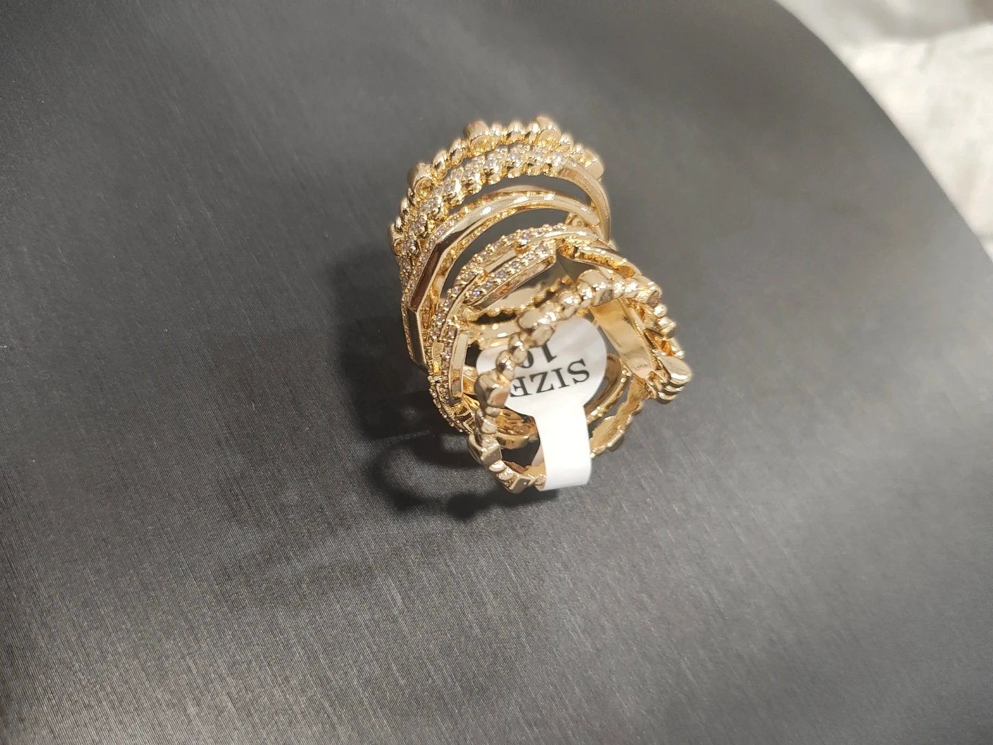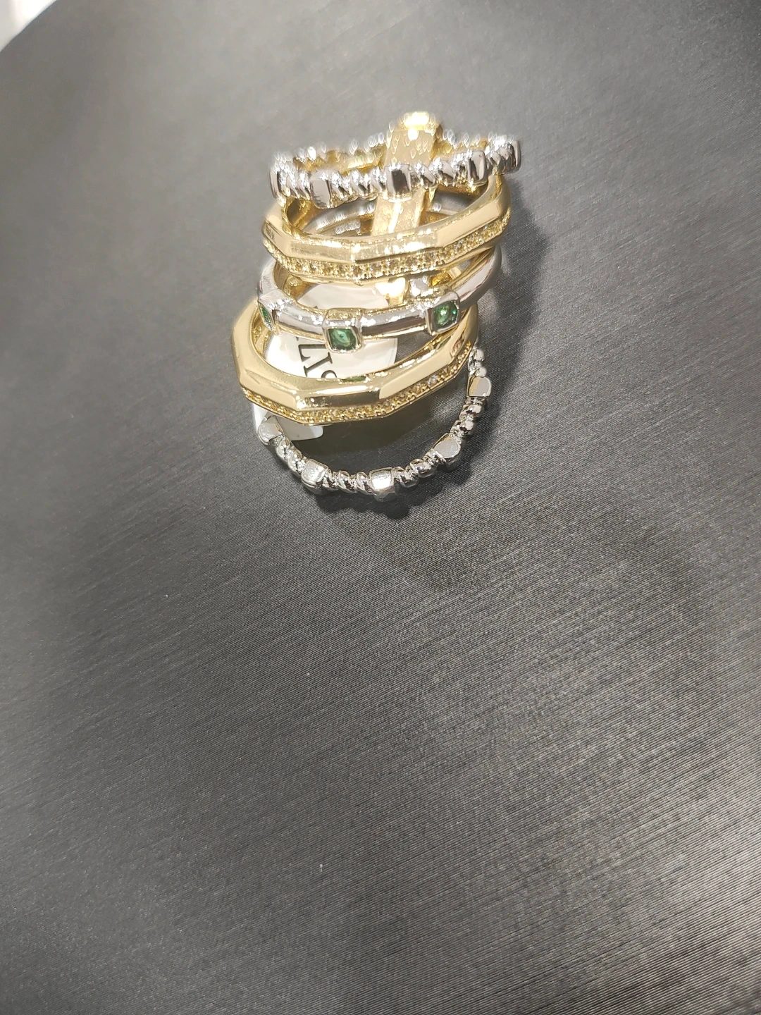 This set includes seven gold-tone stacking rings, many adorned with clear rhinestones. One ring features green accent stones. Sizes are varied for a mixed look. They're great for layering!