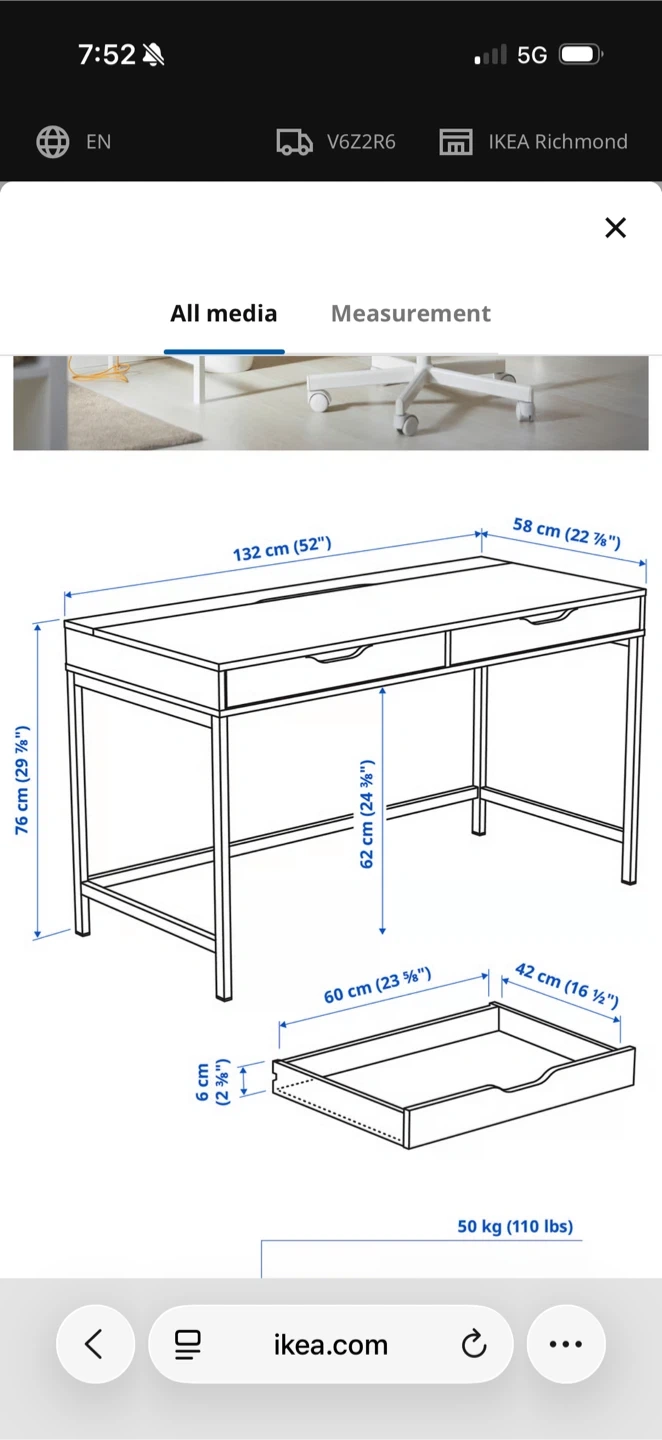 It's 132 cm (52") wide and 76 cm (29") high. The drawer depth is 62 cm (24 3/8").