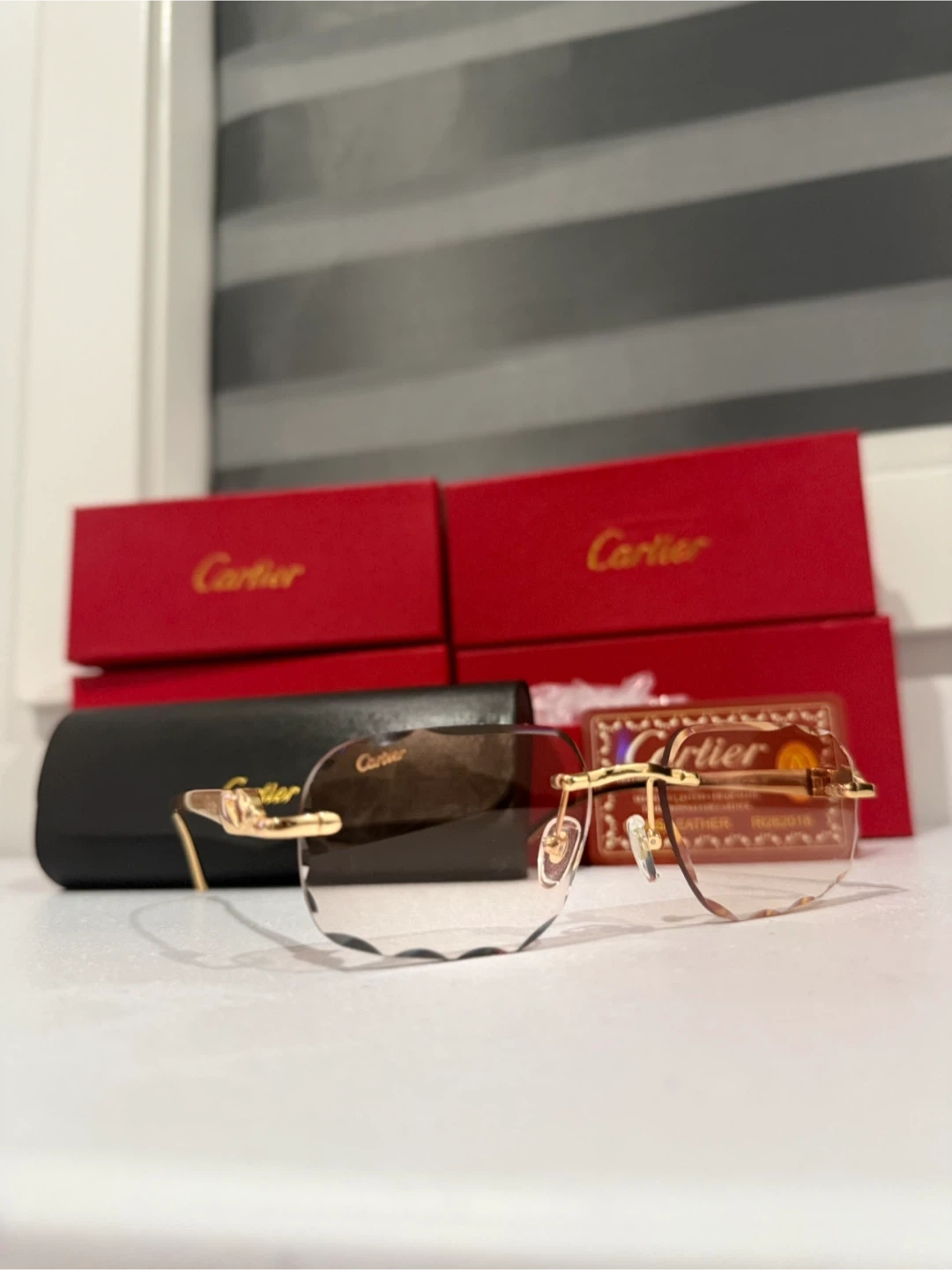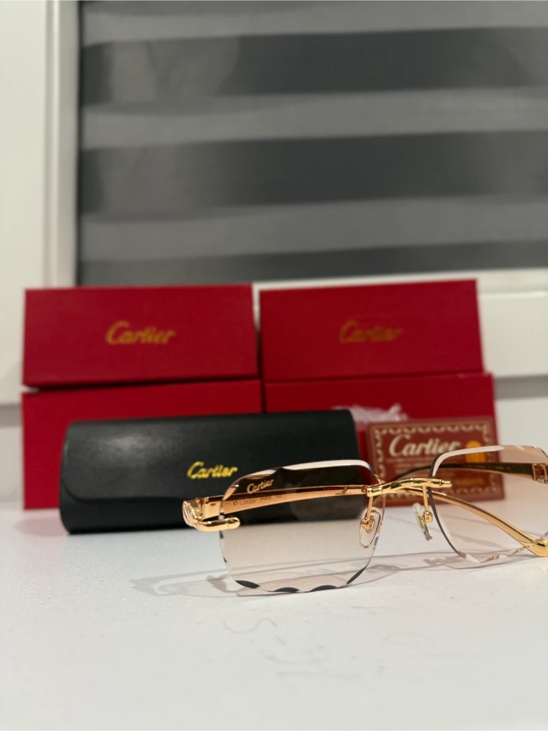 The best quality glasses possible to buy. Elegant Cartier rimless sunglasses with a gold frame. Features a brown gradient lens and includes the original Cartier box and case. These glasses offer a luxurious and sophisticated look.